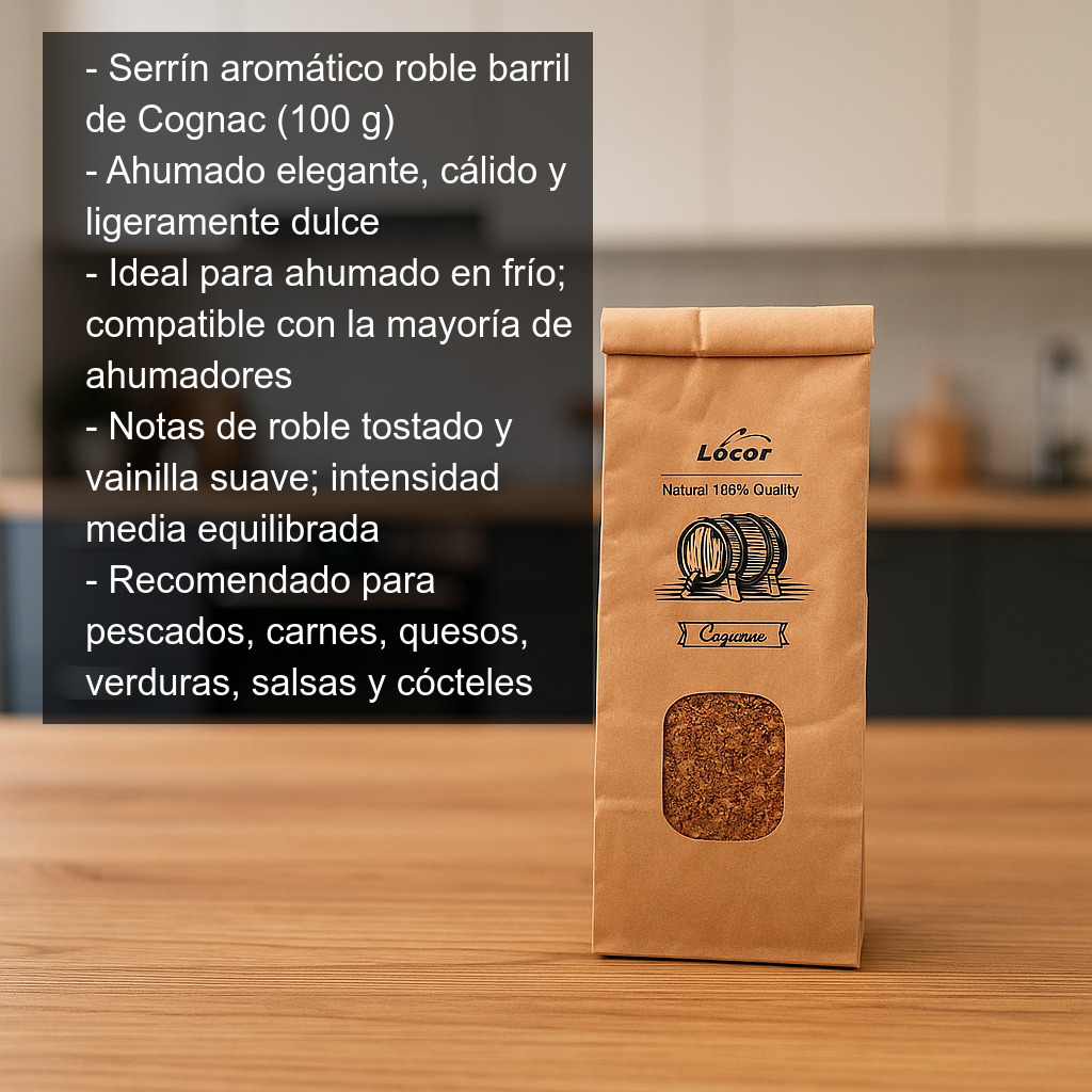 Serrín aromático de roble procedente de barriles de Cognac, ideal para dar a tus elaboraciones un ahumado elegante, cálido y ligeramente dulce. Este serrín se obtiene a partir de viejos barriles de roble que han sido utilizados para el envejecimiento del Cognac, por lo que la madera conserva matices característicos que aportan un aroma único durante el ahumado.