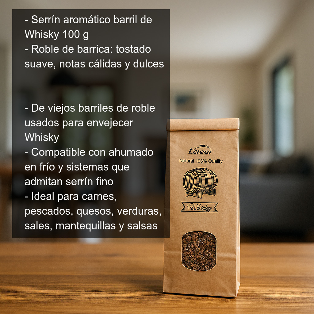 Serrín aromático de barril de Whisky para ahumar alimentos, ideal para quienes buscan un toque intenso y elegante de roble con matices característicos del envejecimiento en barrica. Es compatible con ahumadores para ahumado en frío y también puede utilizarse en otros sistemas de ahumado que admitan serrín fino.