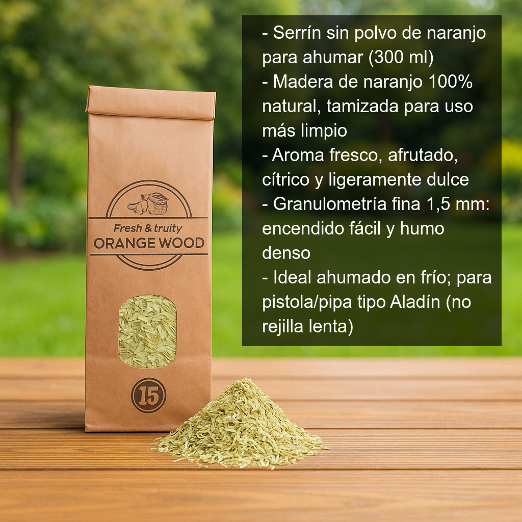 El serrín sin polvo de madera de naranjo para ahumar (300 ml) está elaborado con madera natural cuidadosamente seleccionada y tamizada para ofrecer un ahumado limpio y constante. Produce un humo denso que aporta a los alimentos un aroma fresco, afrutado y ligeramente dulce, característico de las maderas cítricas. Es una opción excelente si buscas un toque aromático más suave que el de maderas intensas, ideal para realzar sin enmascarar el sabor del producto.