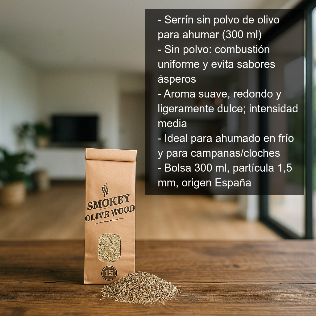El serrín sin polvo de madera de olivo para ahumar (300 ml) es un combustible aromático de madera natural pensado para quienes buscan un ahumado limpio, estable y muy fragante. Al estar libre de polvo, favorece una combustión más uniforme y ayuda a evitar sabores ásperos, aportando un humo denso con el característico aroma suave y mediterráneo del olivo, muy reconocible en elaboraciones tradicionales como los espetos.