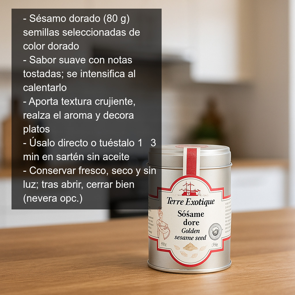 Sésamo dorado (80 g): semillas de sésamo seleccionadas y de color dorado, muy apreciadas en la cocina asiática y mediterránea por su sabor suave con notas tostadas. Son perfectas para aportar textura crujiente, realzar el aroma y decorar todo tipo de platos, tanto dulces como salados.