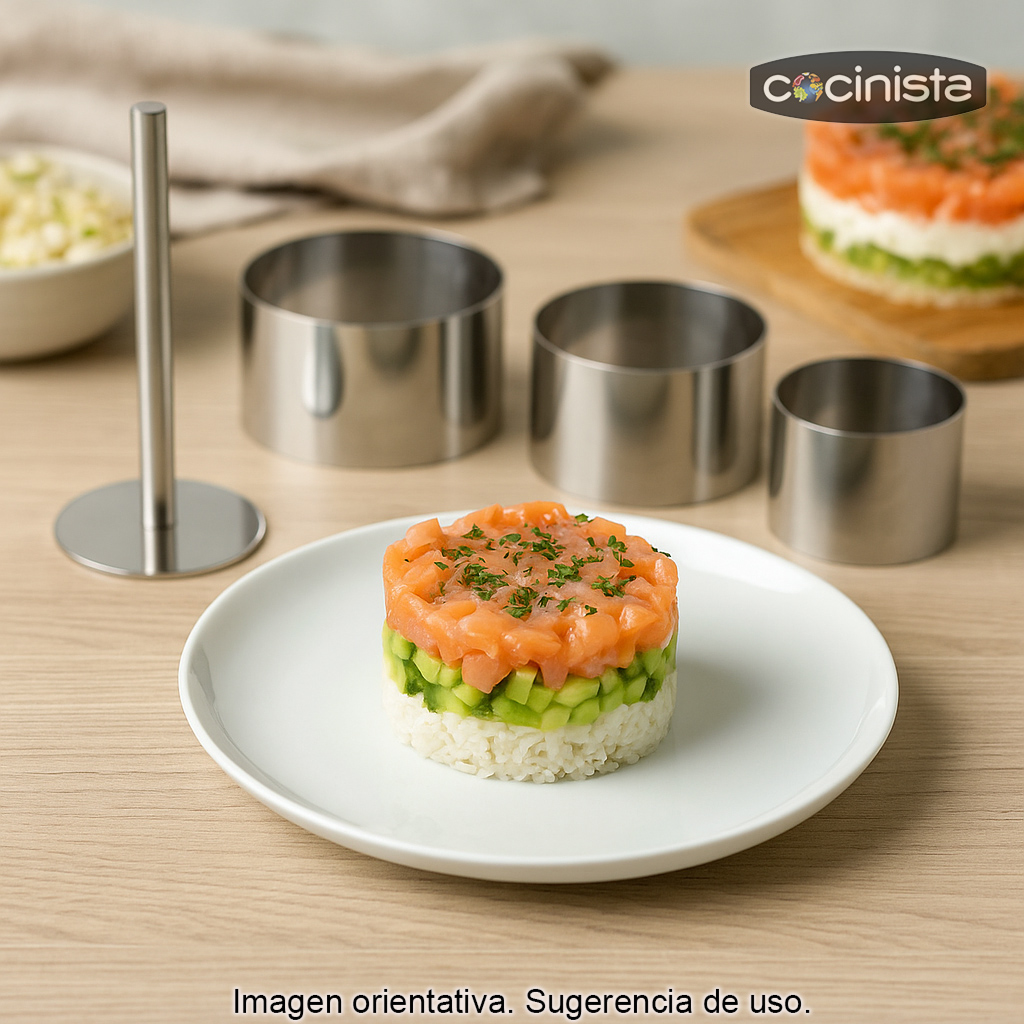 Gracias a sus tres medidas, podrás adaptar el emplatado a diferentes raciones y estilos: desde tartares individuales hasta milhojas, ensaladillas o postres en capas. El pisador te permite prensar el alimento dentro del aro para que mantenga la forma al desmoldar, logrando un resultado estable y bien definido.