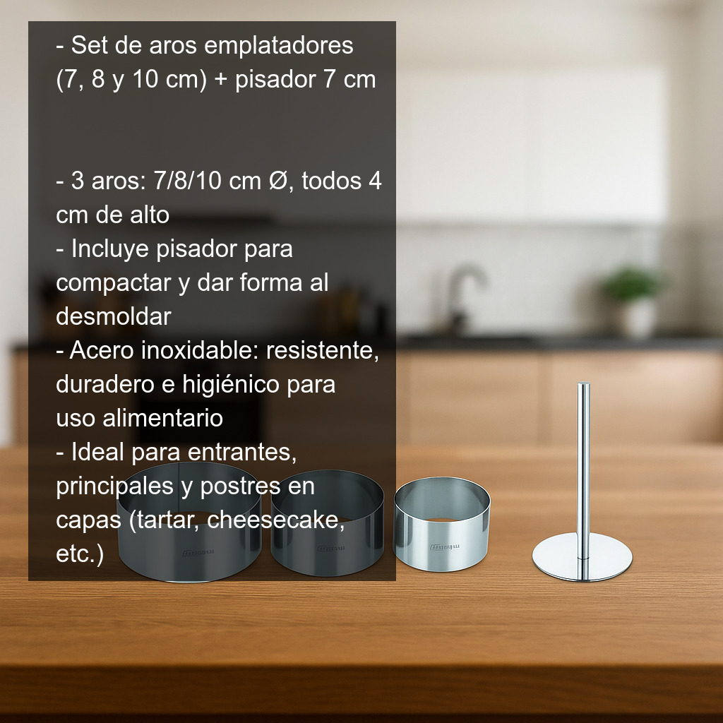 Este set de aros emplatadores es el aliado perfecto para presentar tus platos con un acabado profesional en casa. Incluye tres aros de emplatar de 7, 8 y 10 cm de diámetro (todos con 4 cm de altura) y un pisador de 7 cm para compactar y dar forma con facilidad. Ideal para conseguir presentaciones limpias, uniformes y elegantes en entrantes, platos principales y postres.