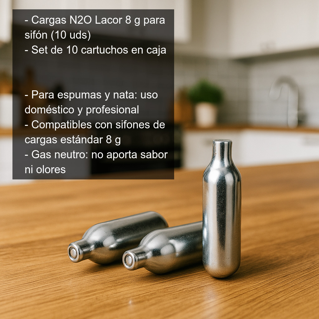 Cargas de óxido nitroso (N2O) de 8 g para sifón de espumas y nata. Este set incluye 10 unidades (10 cartuchos) en caja, ideales para uso doméstico y profesional en cocina creativa, repostería y coctelería. Son cargas de gas de la marca Lacor y, según nuestra experiencia, resultan compatibles con la mayoría de sifones que utilizan cargas estándar de 8 g (por ejemplo, iSi, Lacor, ICO y otros modelos equivalentes).