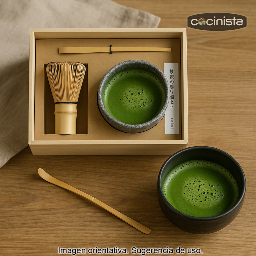 Este juego para preparar matcha incluye los utensilios básicos para dosificar correctamente el polvo, batirlo con la técnica adecuada y conseguir una mezcla homogénea sin grumos.