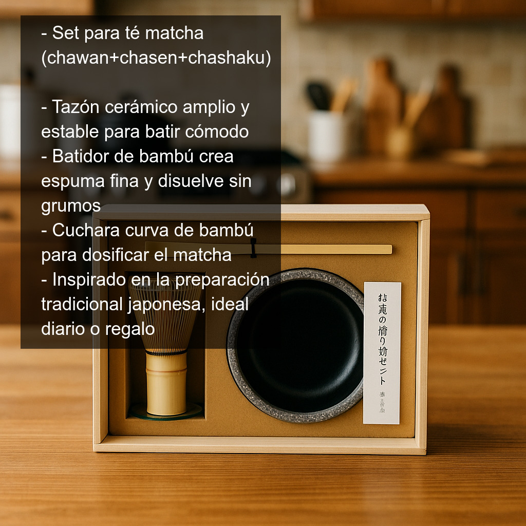 Un set de matcha práctico y bonito para tu rutina diaria, para regalar o para acompañar tus momentos de té con una preparación más auténtica.