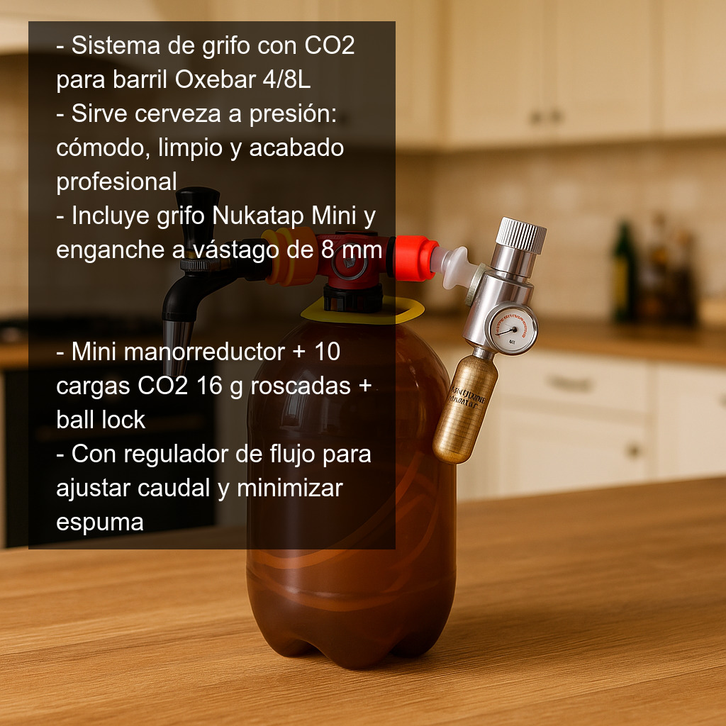 Sistema de grifo con CO2 completo para barril Oxebar de 4 u 8 litros, pensado para que puedas servir cerveza artesana a presión de forma cómoda, limpia y con un acabado profesional. Con este kit podrás dispensar tu propia cerveza casera directamente desde el barril, manteniendo mejor la carbonatación y reduciendo la oxidación frente a sistemas sin gas.