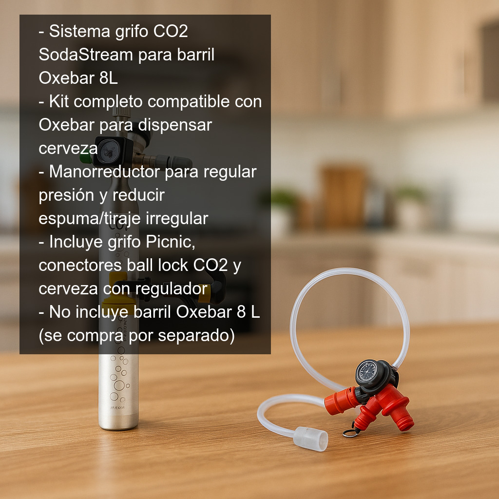 Saca el máximo partido a tu barril Oxebar de 8 litros con este sistema de grifo con CO2 tipo SodaStream, un conjunto completo y compatible pensado para que puedas dispensar cómodamente tu propia cerveza artesana (homebrew) en casa, en reuniones o en eventos. Con este kit podrás servir la cerveza con presión controlada, mejorando la experiencia de tiraje y ayudando a conservar la carbonatación durante más tiempo.
