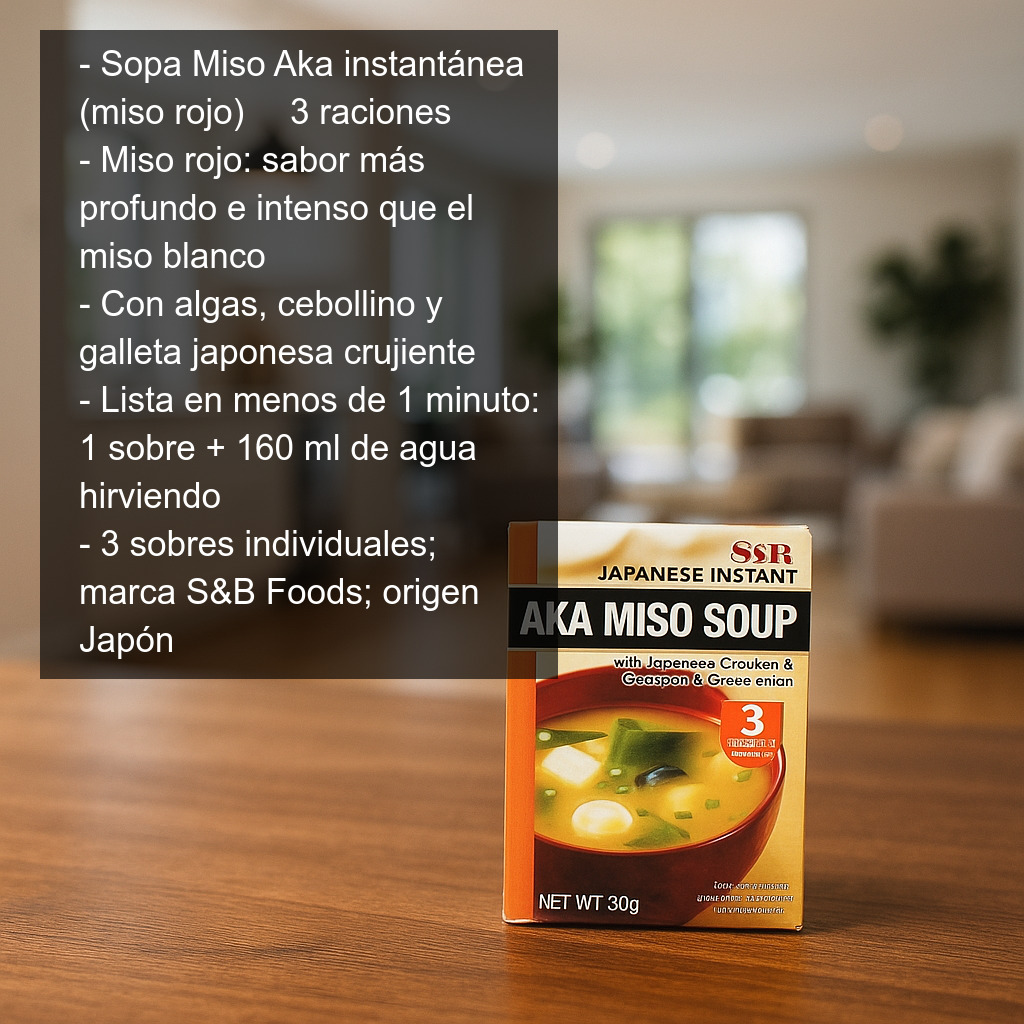 Formato: caja con 3 raciones de sopa miso aka, presentadas en sobres individuales para conservar mejor el aroma y facilitar su uso en cualquier momento (oficina, viajes o comidas rápidas en casa).