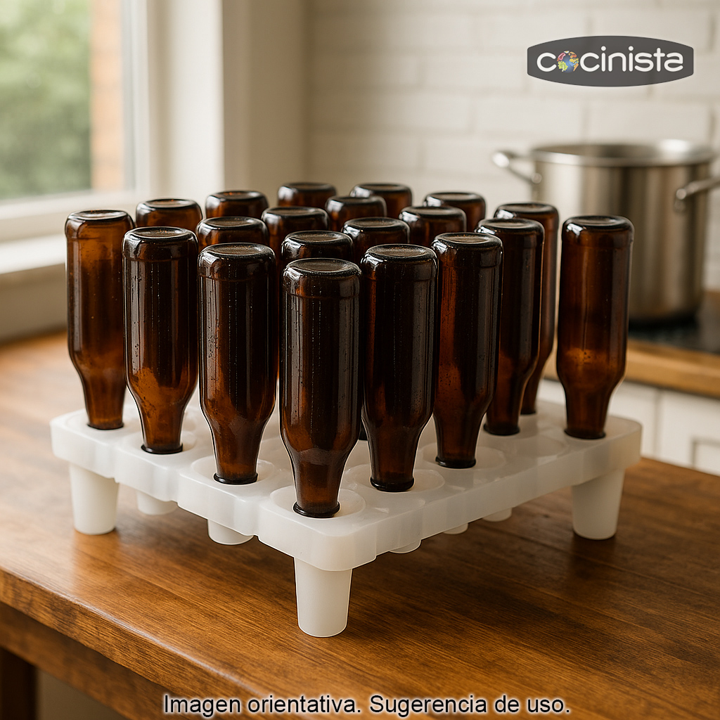 Puede utilizarse tal cual como soporte de escurrido: colocas las botellas boca abajo y dejas que el agua o la solución desinfectante escurra de manera natural, ayudando a reducir goteos y a mantener la zona de trabajo más limpia.