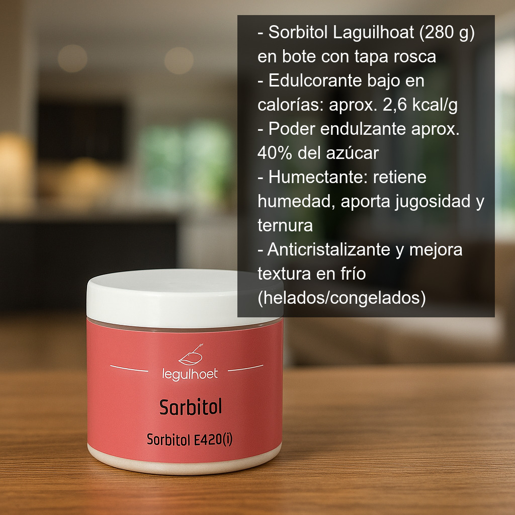 El sorbitol es un edulcorante de bajo contenido calórico (aprox. 2,6 kcal por gramo) y con un poder endulzante inferior al del azúcar (alrededor de un 40%). Por su perfil, es un ingrediente muy utilizado en repostería y elaboraciones dulces cuando se busca reducir el aporte calórico y ajustar el dulzor sin renunciar a una buena textura.