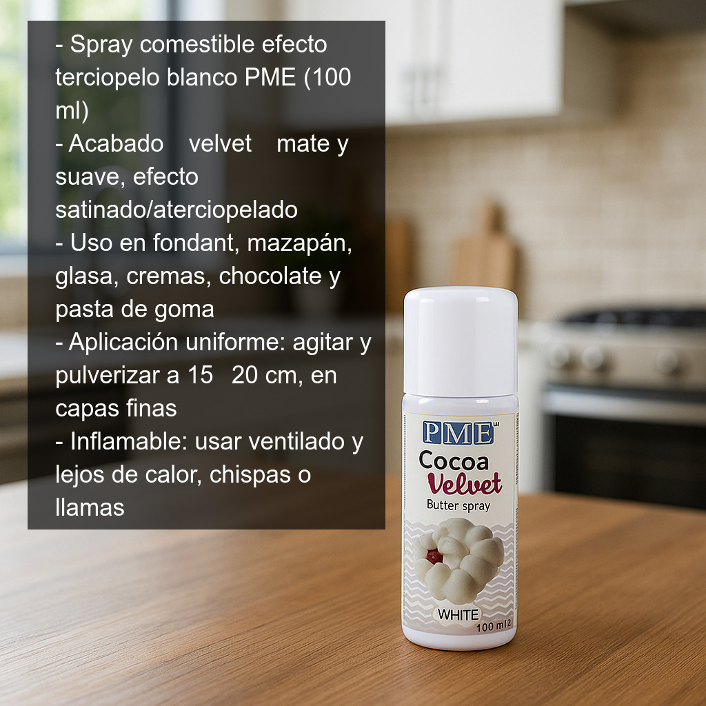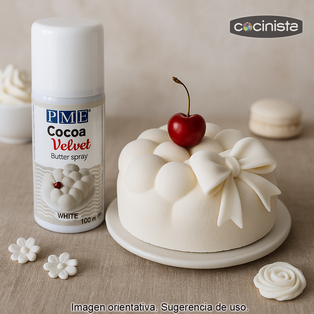 Spray comestible efecto terciopelo blanco (100 ml) de PME, ideal para conseguir un acabado profesional tipo “velvet” en tus creaciones de repostería creativa. Este spray terciopelo blanco aporta una textura suave y mate, con un elegante efecto satinado/aterciopelado que realza el volumen y los detalles de la decoración.