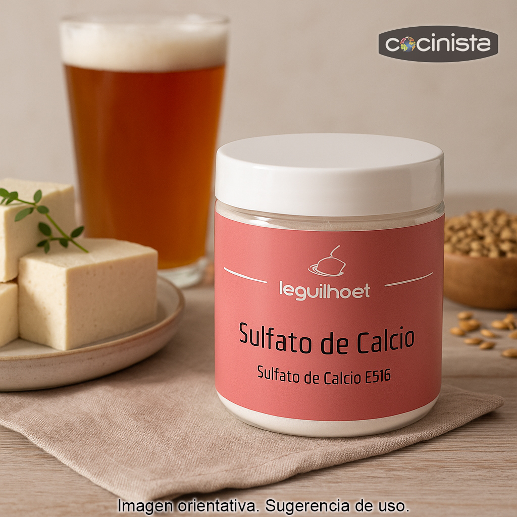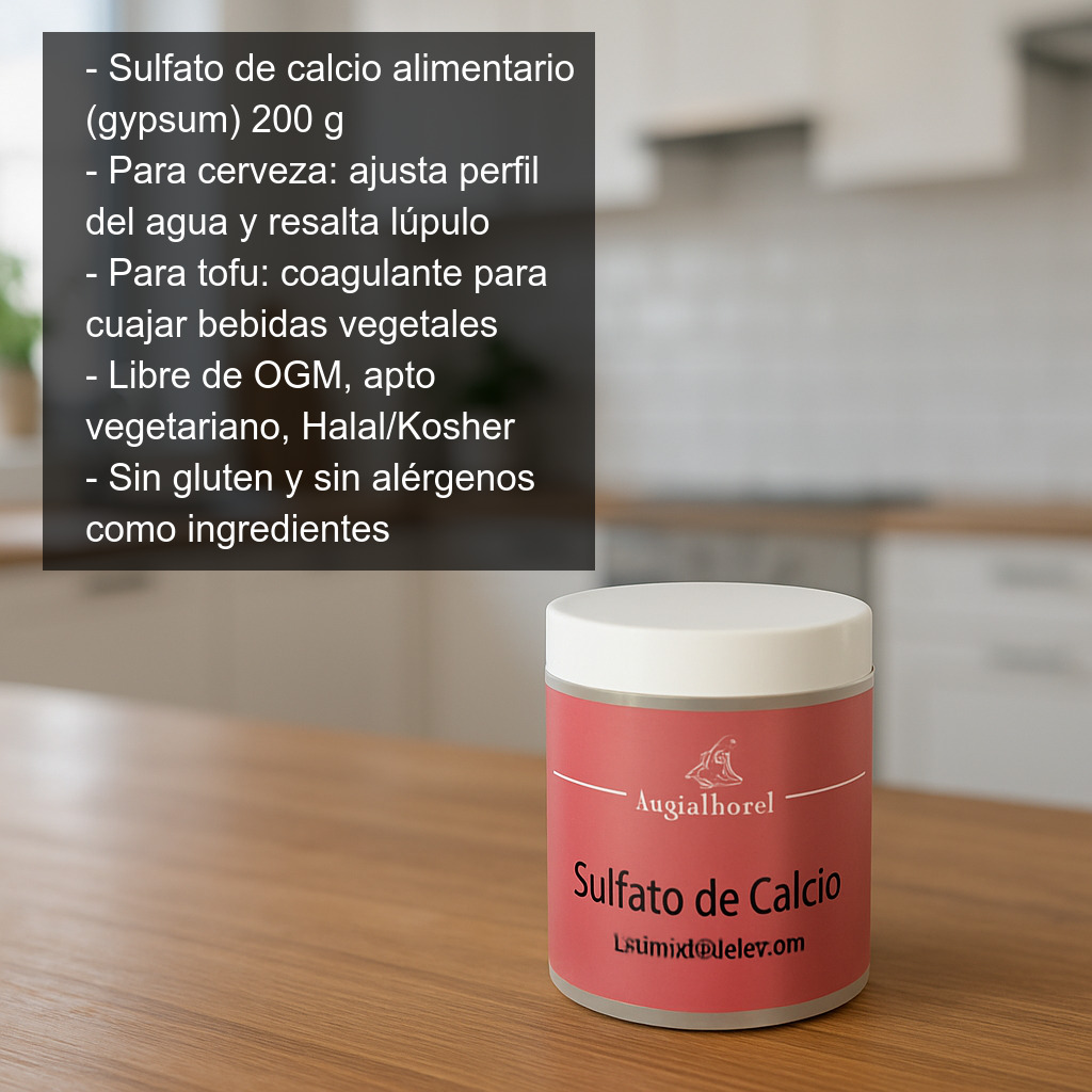 El sulfato de calcio alimentario (también conocido como gypsum) es un mineral en polvo de alta pureza, muy utilizado tanto en elaboración de cerveza artesanal como en cocina vegetal para la preparación de tofu. Este formato se presenta en un práctico frasco de 200 g, ideal para dosificar con precisión y conservar el producto en buen estado.