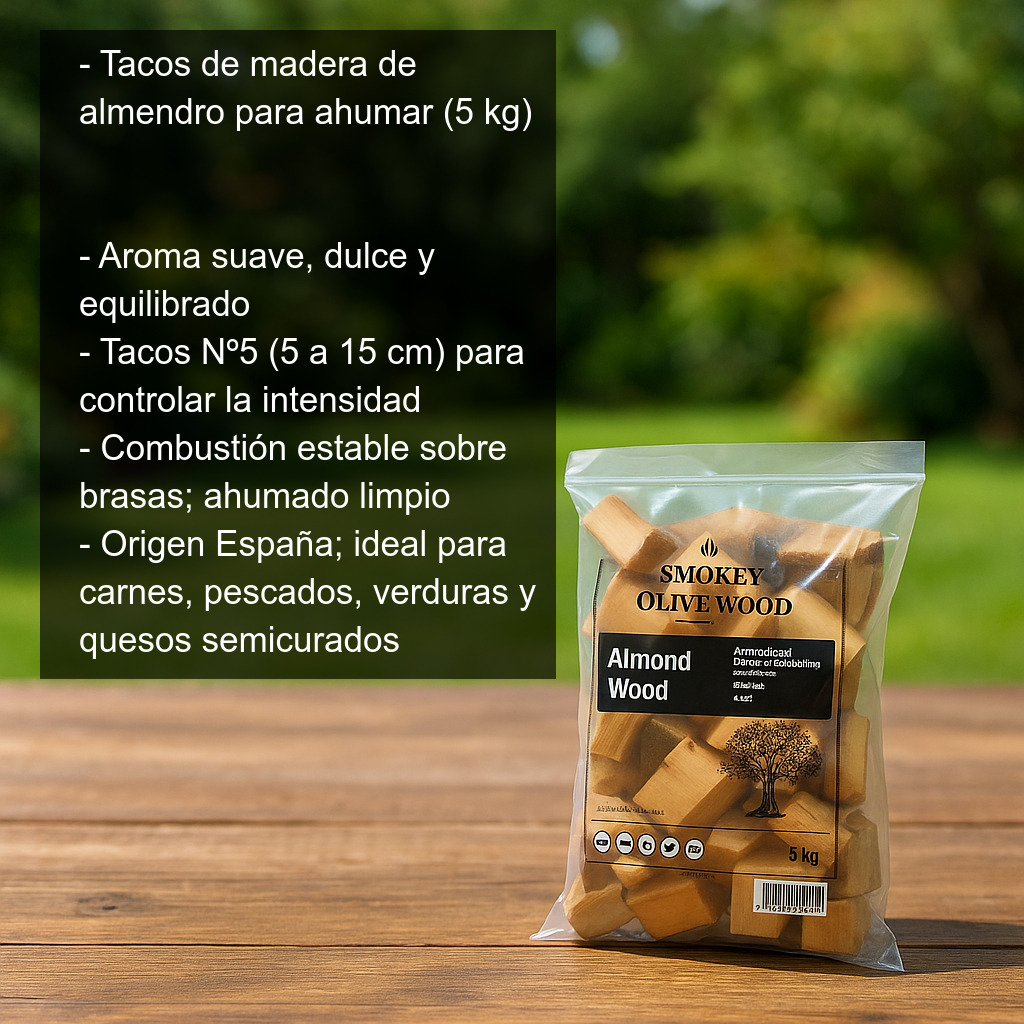Si buscas una madera para ahumar que aporte un toque aromático fino y versátil, los tacos de almendro son una elección ideal para elevar tus barbacoas y ahumados con un sabor natural y equilibrado.