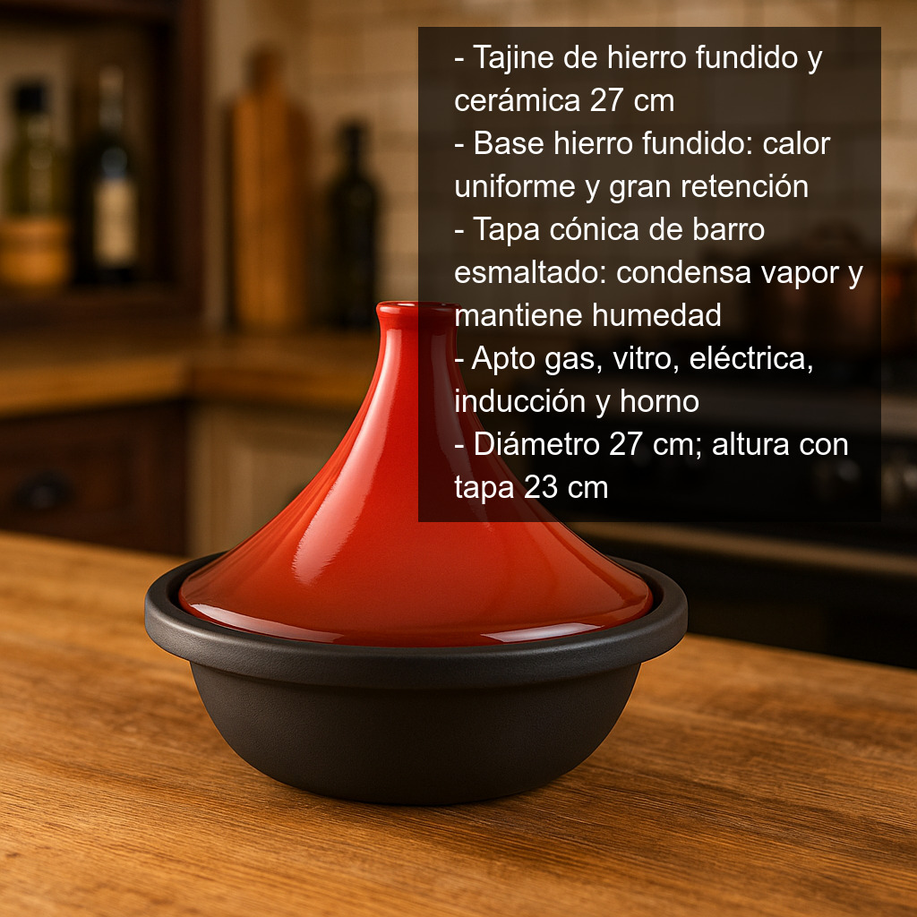 El tajine de hierro fundido y cerámica de 27 cm es un utensilio de cocina tradicional ideal para preparar tajines marroquíes y todo tipo de guisos aromáticos que se cocinan lentamente en su propio jugo. Su diseño combina dos materiales pensados para obtener un resultado jugoso y lleno de sabor: una base de hierro fundido (color negro) que reparte el calor de forma uniforme y una tapa cónica de barro natural esmaltado (color marrón) que favorece la condensación del vapor para que los alimentos se mantengan tiernos y húmedos.