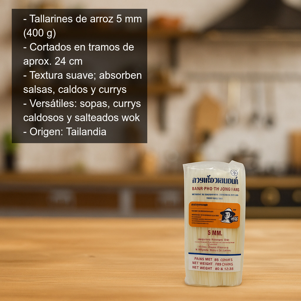 Tallarines de arroz de 5 mm (400 g), también conocidos como fideos de arroz tipo tallarín, cortados en tramos de aproximadamente 24 cm. Son un ingrediente imprescindible en la cocina asiática (especialmente en la cocina tailandesa), por su textura suave y su capacidad para absorber salsas, caldos y currys.
