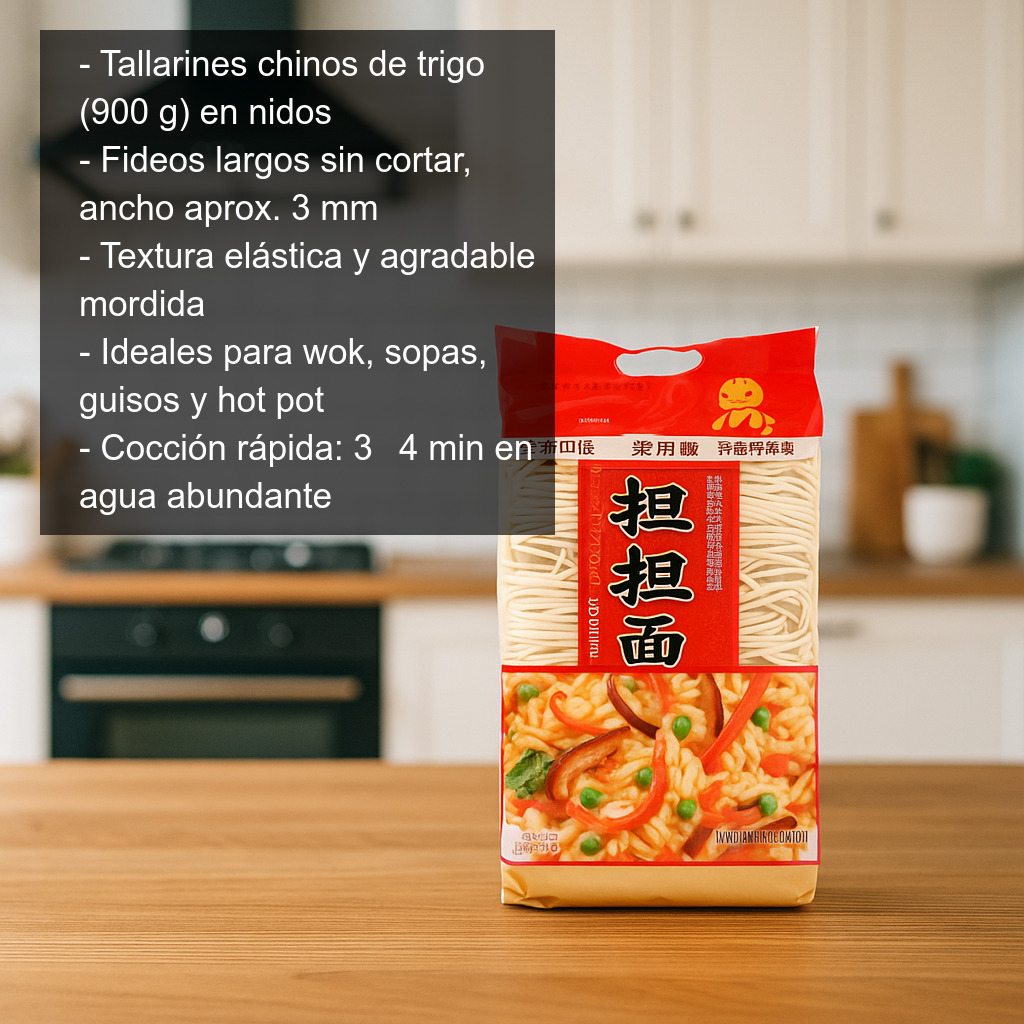 Estos tallarines de trigo estilo chino son una base versátil y deliciosa para preparar en casa recetas asiáticas con textura elástica y agradable mordida. Se trata de fideos largos sin cortar, con un ancho aproximado de 3 mm, ideales para absorber salsas y caldos sin perder consistencia.
