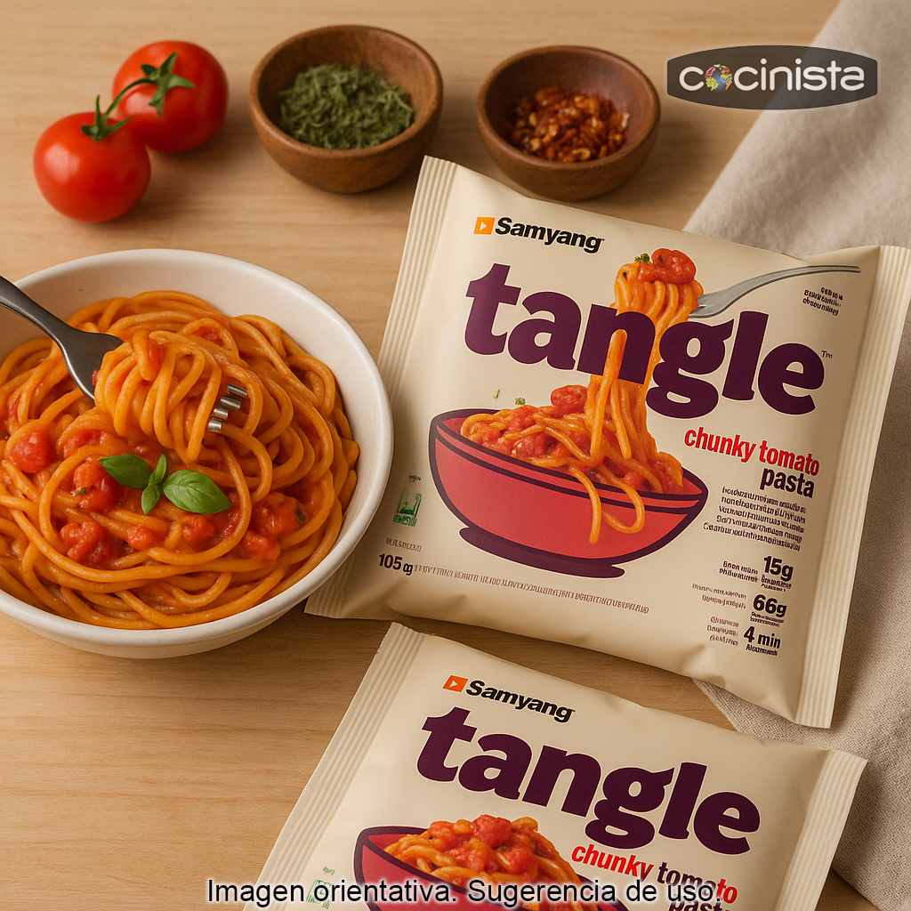 Descubre una forma diferente de disfrutar la pasta con estos tallarines instantáneos sabor a chunky tomate (105 g): una propuesta que combina la practicidad de los noodles coreanos con un perfil de sabor claramente mediterráneo. Tangle Pasta con Salsa de Tomate incluye una salsa espesa y aromática elaborada con tomate maduro, hierbas como albahaca y orégano, y trozos reales de tomate que aportan textura y un acabado “casero” irresistible.