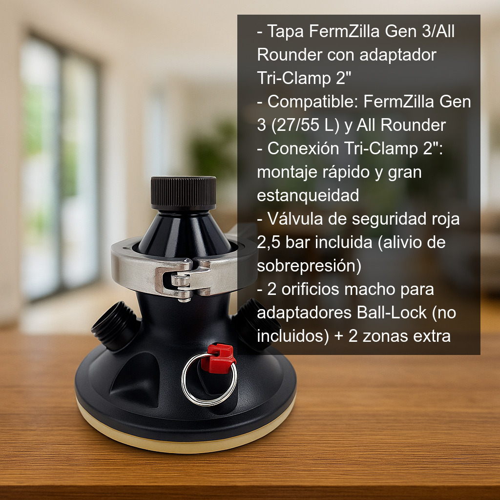 Esta tapa te permite convertir la parte superior del fermentador en un punto de conexión versátil. Es especialmente útil si buscas: