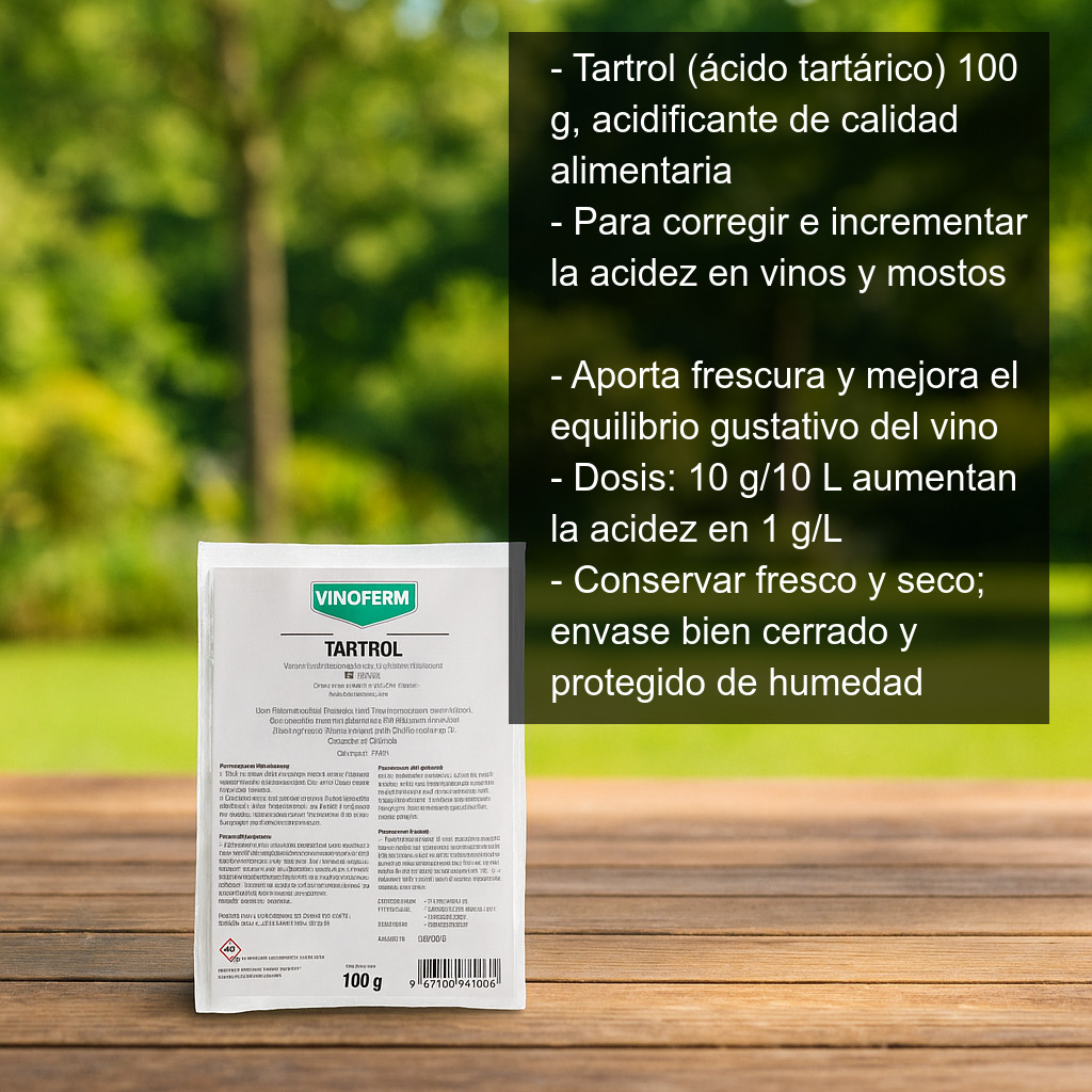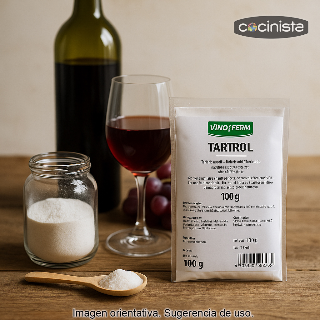 El Tartrol (ácido tartárico) 100 g es un acidificante de calidad alimentaria especialmente indicado para la corrección de la acidez en vinos y otras elaboraciones. El ácido tartárico es uno de los ácidos naturales más característicos de la uva y se utiliza en enología para ajustar el equilibrio gustativo, aportando una acidez más marcada y ayudando a conseguir un perfil más fresco y estable.