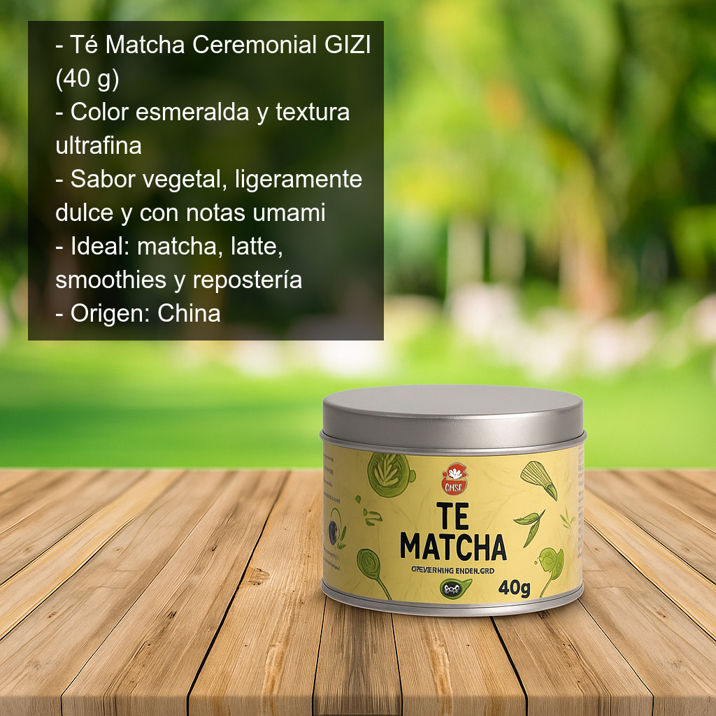 Descubre el Té Matcha Ceremonial GIZI (40 g), un auténtico tesoro verde para quienes buscan una experiencia de té matcha intensa, aromática y equilibrada. Elaborado a partir de hojas de té verde finamente molidas, este matcha en polvo destaca por su color esmeralda, su textura ultrafina y su perfil de sabor vegetal, ligeramente dulce y con notas umami, característico del buen matcha.
