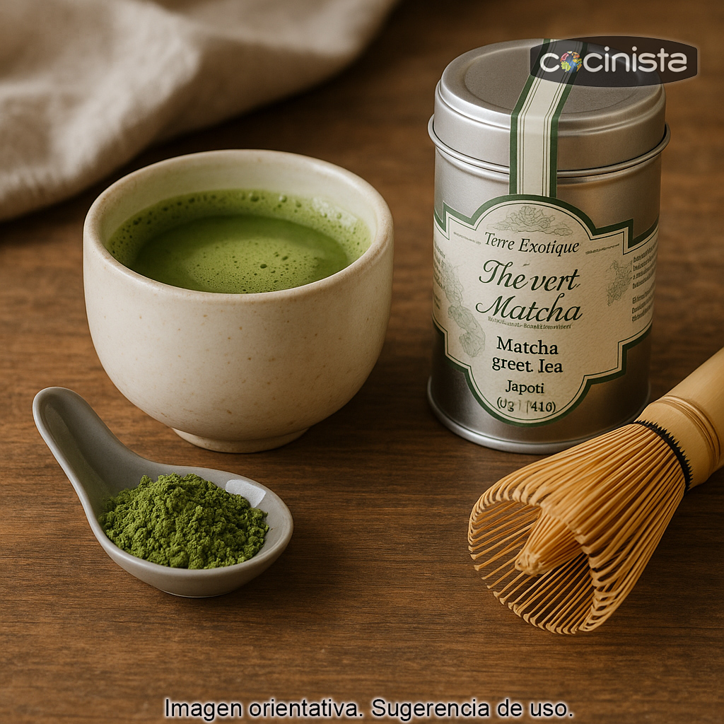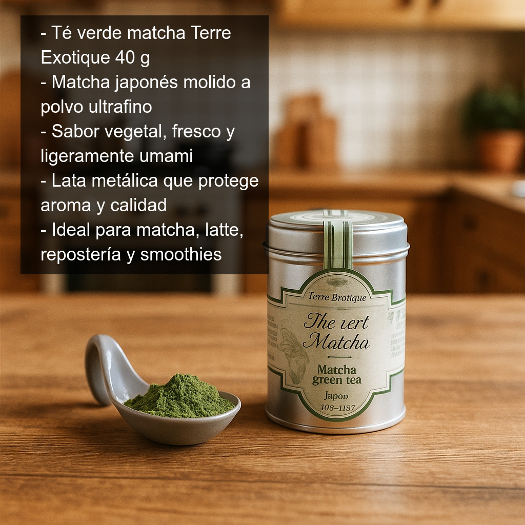 Este matcha de Terre Exotique es original de Japón y se presenta en un elegante envase metálico que ayuda a proteger el aroma y la calidad del té. Contiene 40 g de té matcha en polvo, ideal tanto para preparaciones tradicionales como para recetas modernas.