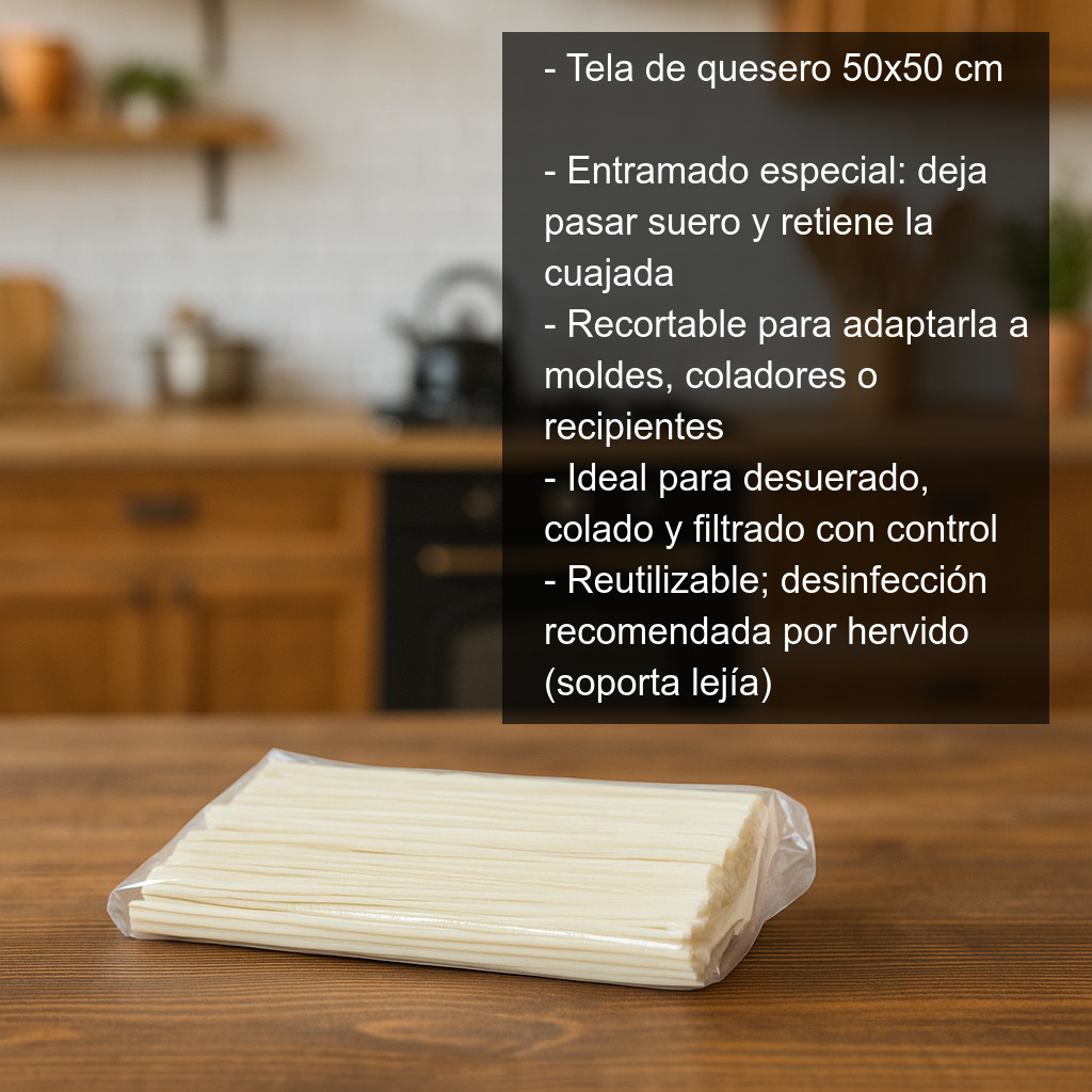 La tela de quesero (también conocida como gasa de quesería) es un imprescindible para elaborar queso en casa y para trabajos de colado, filtrado y desuerado con total control. Esta pieza de 50 x 50 cm se puede cortar al tamaño deseado para adaptarla a distintos moldes, coladores o recipientes, convirtiéndose en una herramienta muy versátil tanto para principiantes como para aficionados avanzados a la quesería.