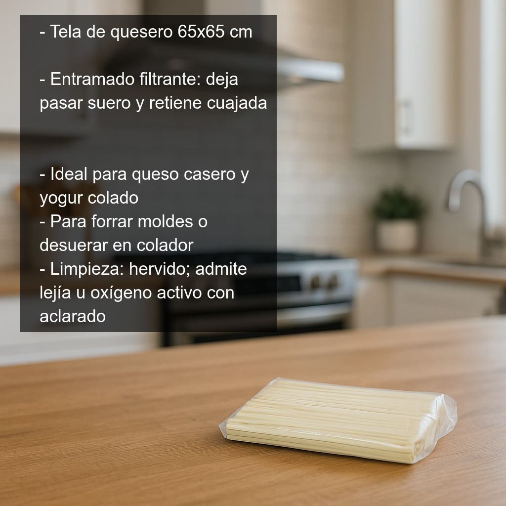 La tela de quesero (también conocida como paño de quesería o gasa para queso) de 65 x 65 cm es un accesorio imprescindible para la elaboración de queso casero, yogur colado y otras preparaciones lácteas. Su entramado especial está diseñado para dejar pasar el suero y otros líquidos, pero retener la cuajada, facilitando un desuerado limpio y uniforme.
