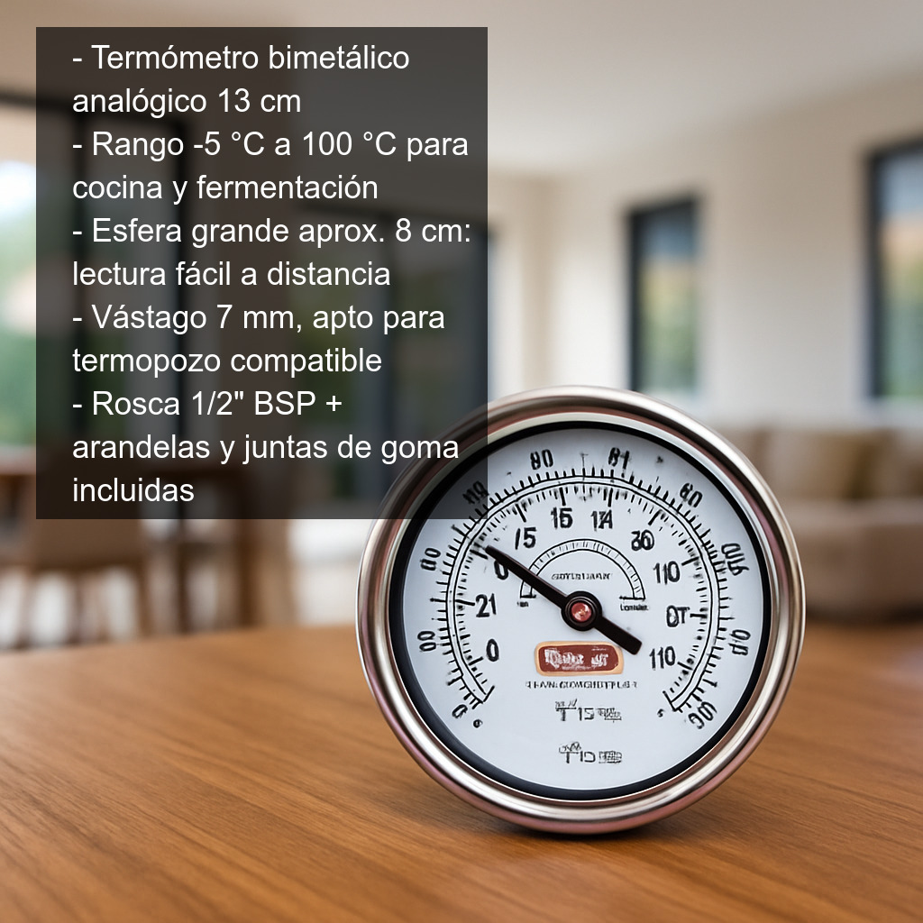 Este termómetro bimetálico analógico de 13 cm es una herramienta robusta y precisa para el control de temperatura en elaboraciones de cocina, fermentación y procesos con líquidos. Está diseñado para medir directamente en el líquido (caldos, almíbares, aceites, agua, mostos, etc.) o para instalarse mediante un termopozo, ofreciendo una lectura estable sin necesidad de componentes electrónicos.