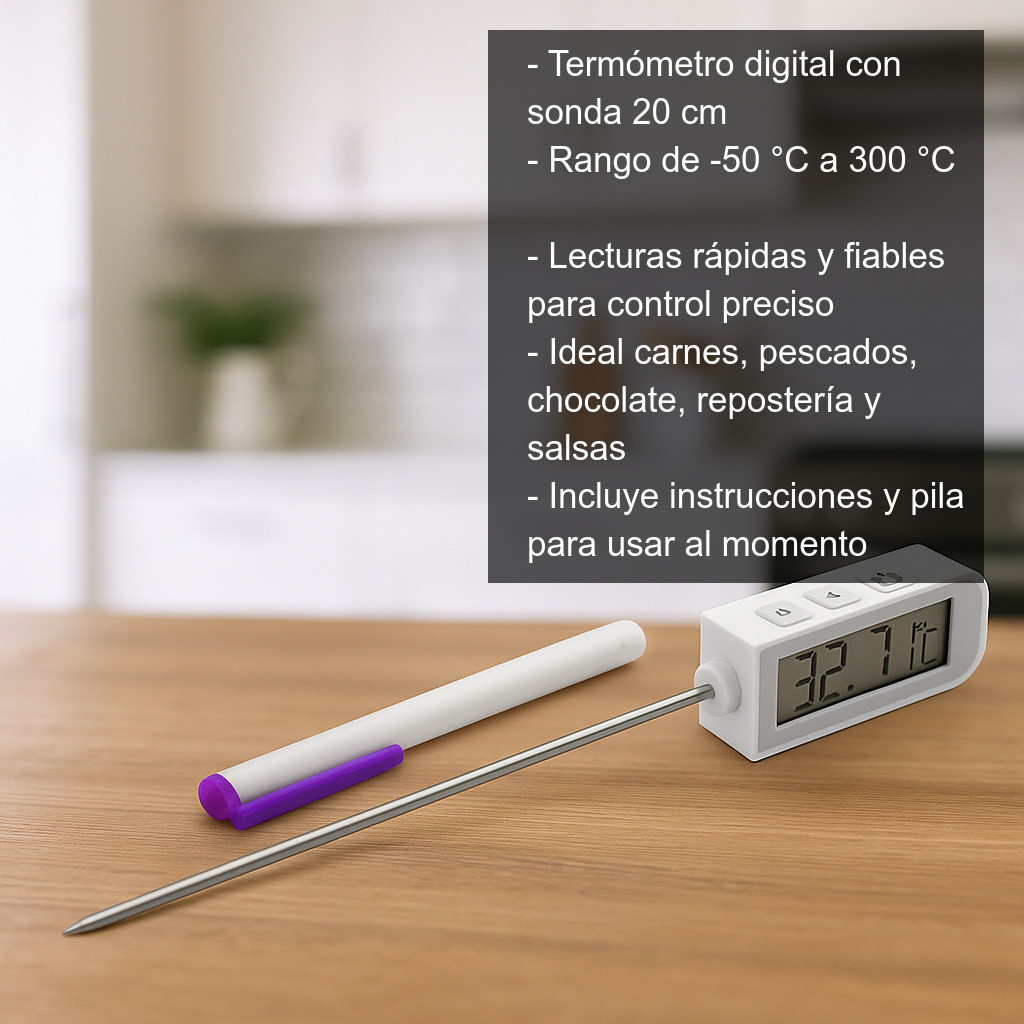 Este termómetro digital con sonda de 20 cm es una herramienta imprescindible para controlar la temperatura con precisión en cocina y repostería. Ideal para conseguir el punto perfecto en carnes (asados, filetes, hamburguesas), pescados, chocolate (templado), cremas, salsas, almíbares, caramelo y todo tipo de elaboraciones donde unos grados marcan la diferencia.