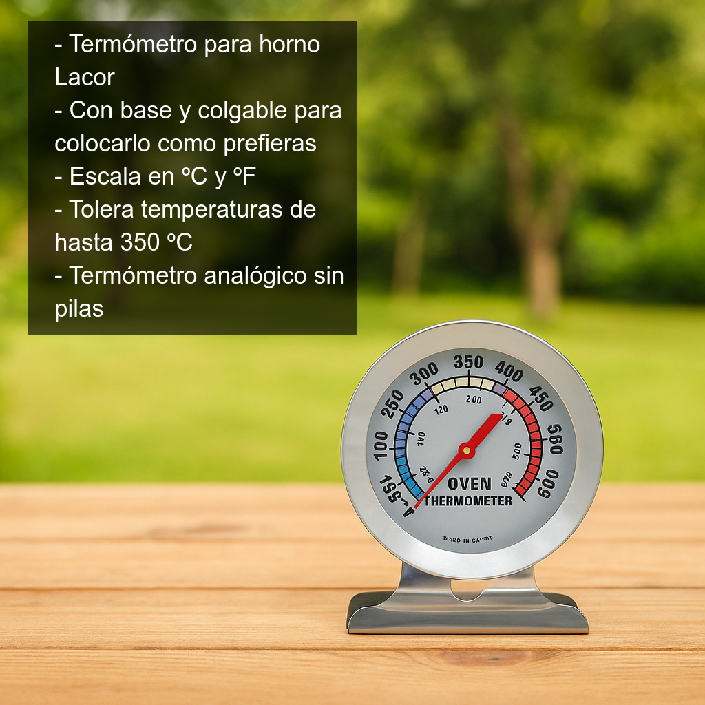 El termómetro de horno, de la marca Lacor, tolera temperaturas de hasta 350ºC. Se trata de un termómetro analógico que funciona siempre sin necesita de pilas.