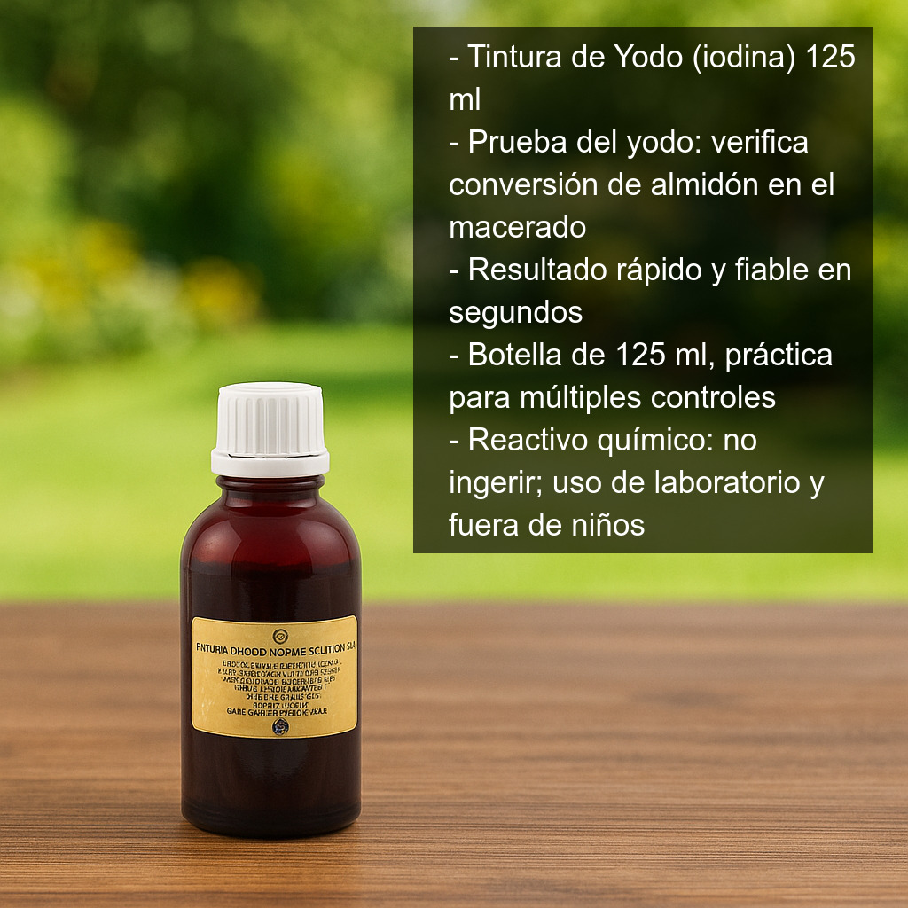 La Tintura de Yodo (iodina) 125 ml es un reactivo imprescindible para el cervecero casero y para cualquier proceso de elaboración de cerveza en el que se quiera verificar, de forma rápida y fiable, si el macerado de las maltas ha completado la conversión del almidón en azúcares fermentables. Esta comprobación, conocida como prueba del yodo, ayuda a asegurar una buena extracción, mejorar la eficiencia del macerado y evitar problemas posteriores en el hervido o la fermentación.