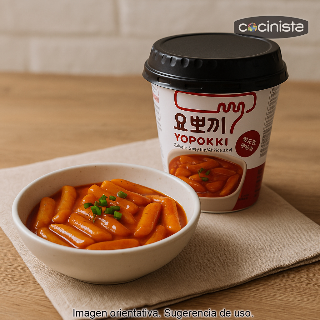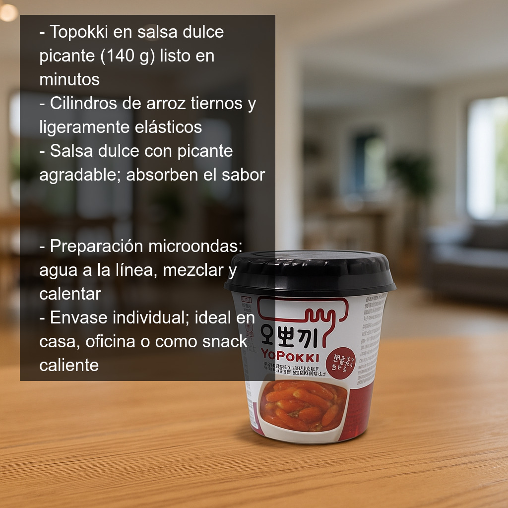 En este formato te proponemos un topokki en salsa dulce picante, un preparado listo para disfrutar en pocos minutos. La salsa combina un toque dulce con un picante agradable, ideal para quienes quieren probar un clásico coreano de forma rápida y cómoda en casa, en la oficina o como snack caliente.