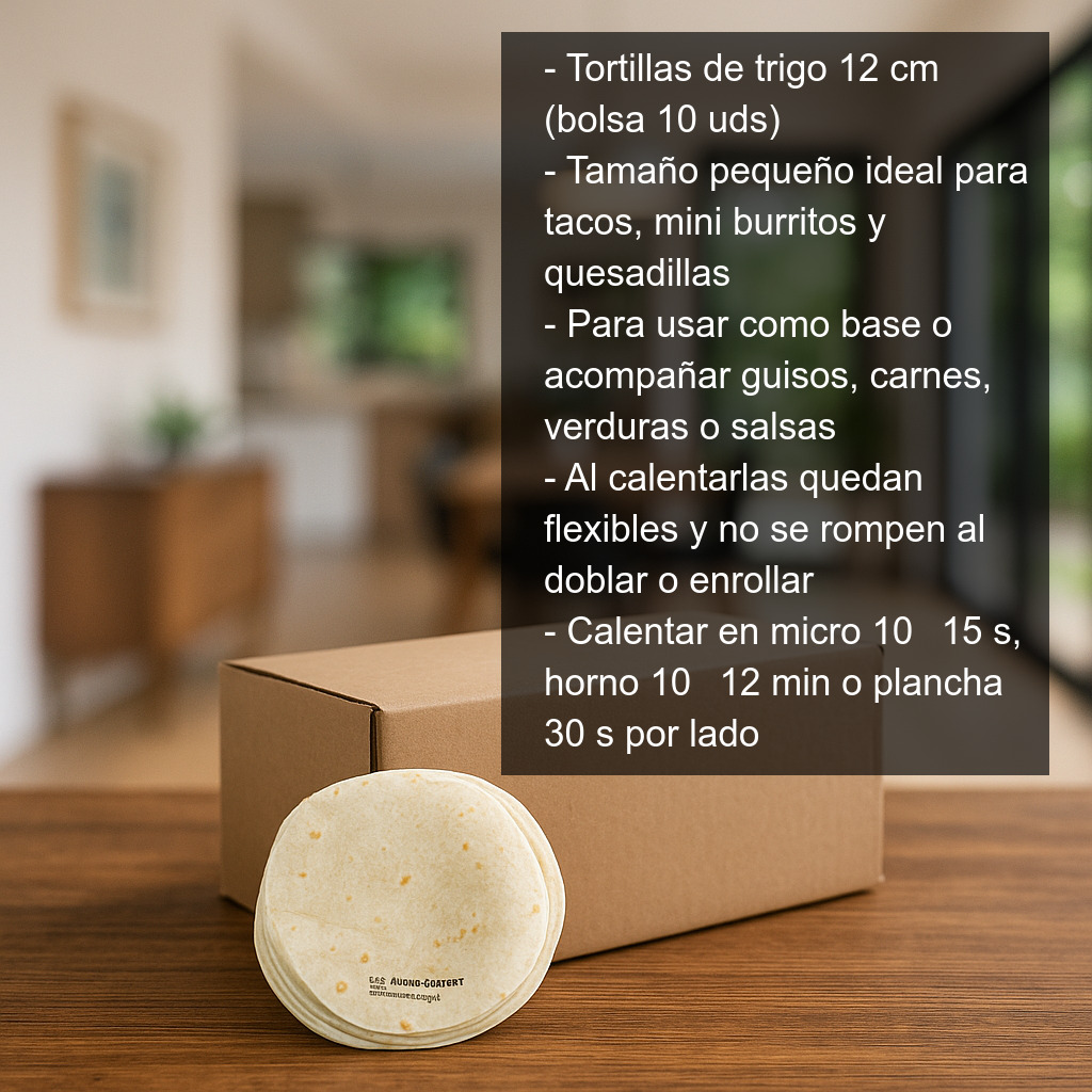 Las tortillas de trigo de 12 cm (bolsa de 10 unidades) son un básico imprescindible para preparar en casa auténticas recetas de inspiración mexicana y tex-mex. Su tamaño pequeño es perfecto para tacos, mini burritos, quesadillas y aperitivos para compartir, ya que permiten servir raciones individuales cómodas y bien presentadas.