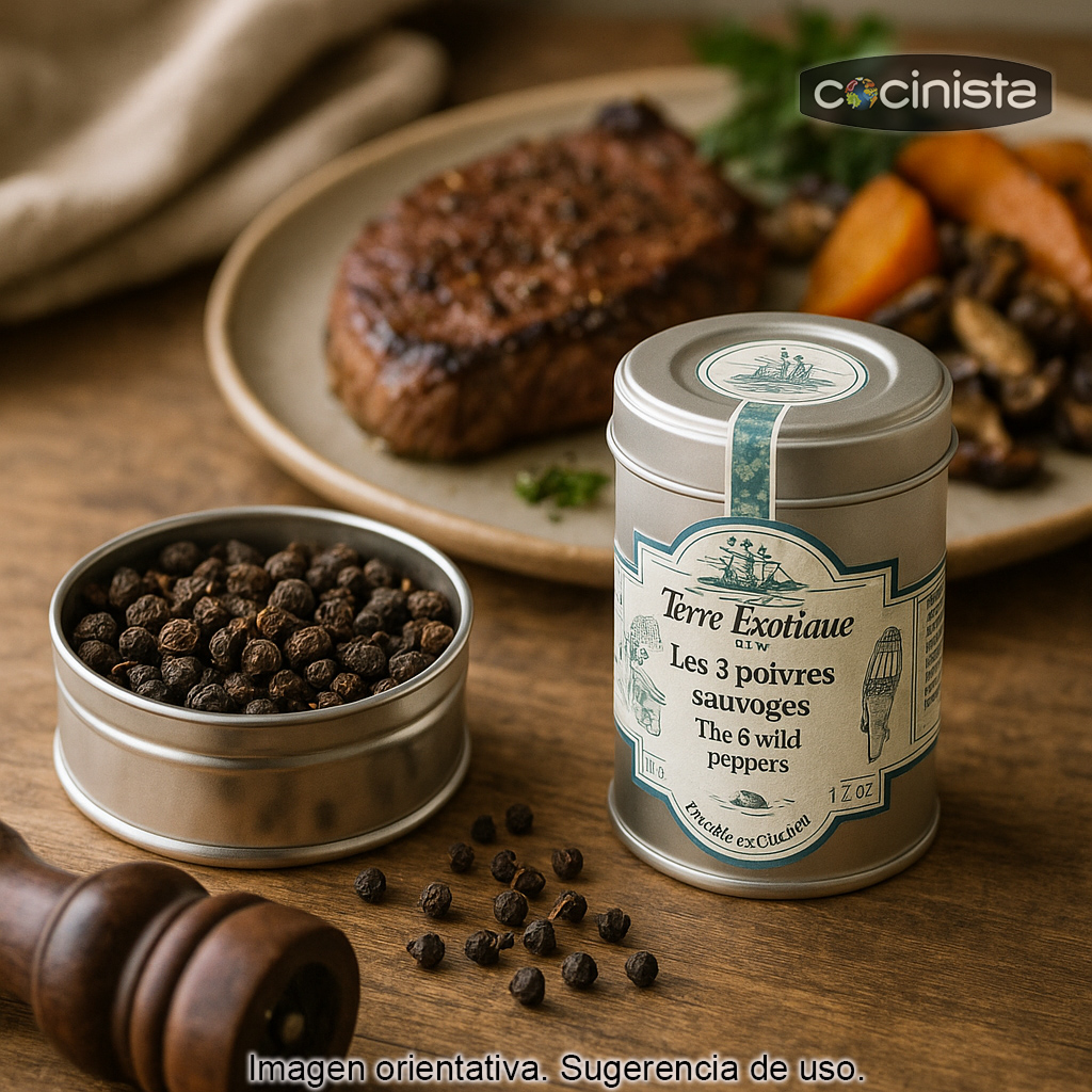 Esta mezcla de tres pimientas salvajes se presenta en un elegante frasco metálico con 50 g de contenido, ideal para proteger el aroma y para tenerla siempre a mano en la cocina.