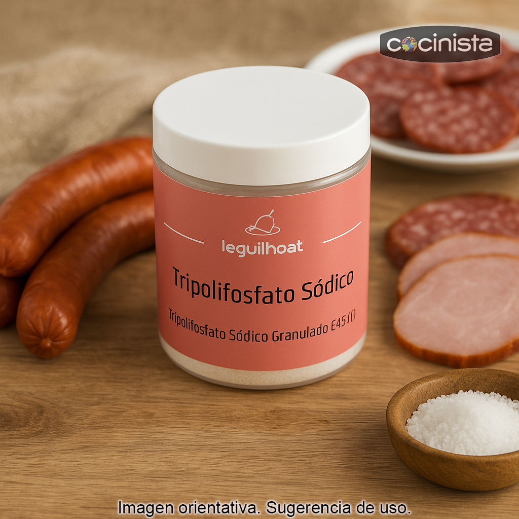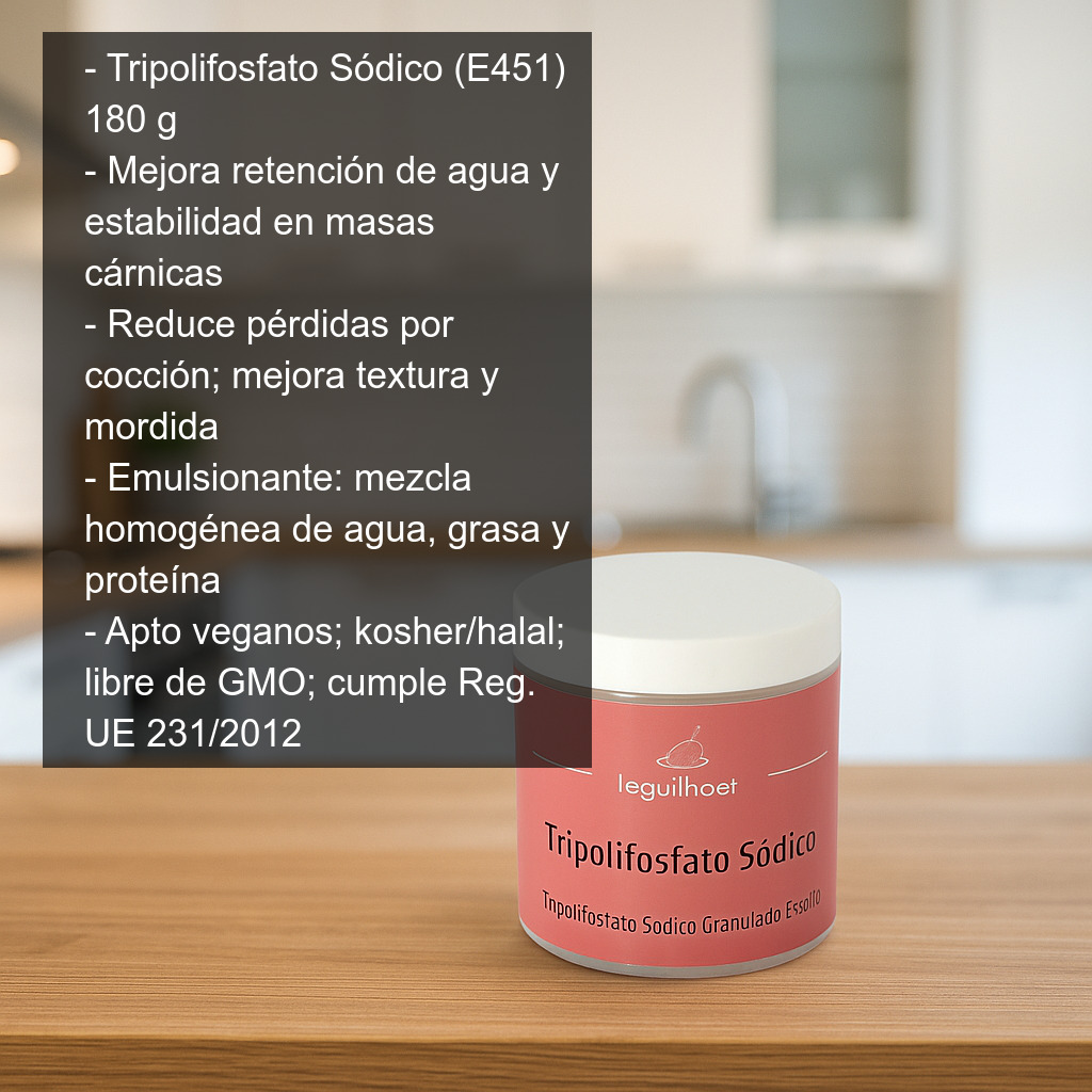Tripolifosfato Sódico (E451) es un aditivo alimentario ampliamente utilizado en elaboraciones cárnicas y de charcutería (embutidos, salchichas, fiambres y preparados cárnicos) por su capacidad para mejorar la retención de agua y la estabilidad de la masa.