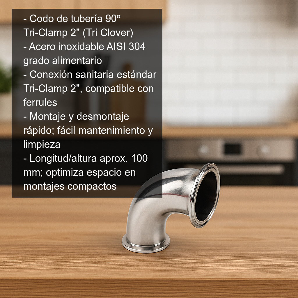 Codo de tubería 90º Tri-Clamp de 2" (también conocido como Tri Clover 2"), ideal para realizar cambios de dirección en instalaciones de proceso con conexión sanitaria. Fabricado en acero inoxidable AISI 304 de calidad alimentaria, es una pieza robusta y fiable para montajes donde se requiere higiene, resistencia a la corrosión y facilidad de limpieza.
