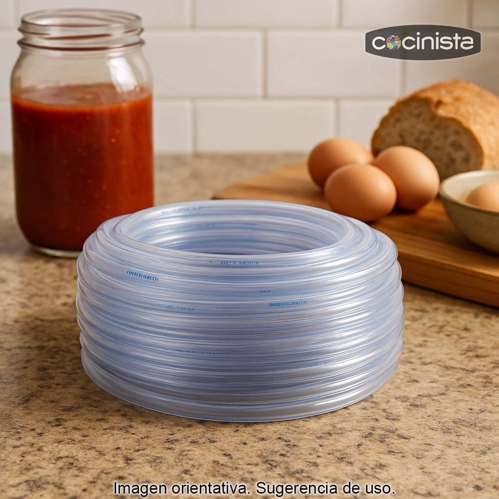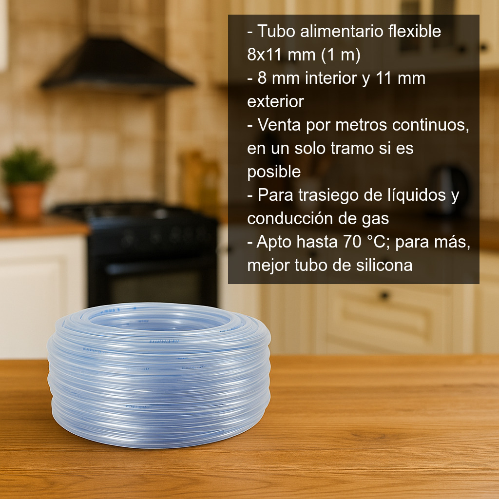 Este tubo de uso alimentario es ideal para instalaciones y conexiones en cocina, elaboraciones caseras y pequeños equipos donde se necesite un conducto flexible y seguro para el contacto con alimentos. Sus medidas son 8 mm de diámetro interior y 11 mm de diámetro exterior, un formato muy habitual para conexiones de trasiego y conducciones en sistemas compactos.