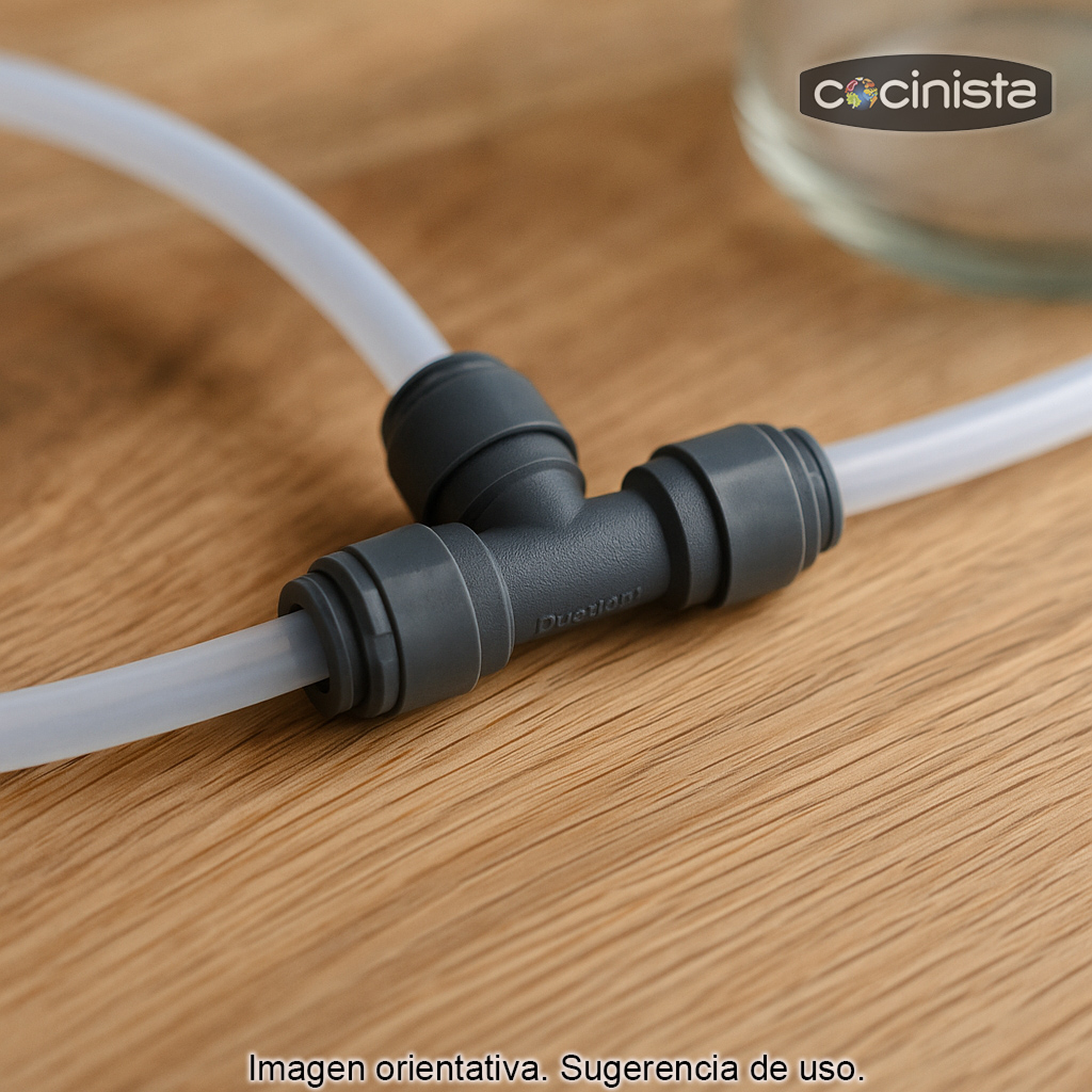 Este racor incorpora tres conexiones push fit compatibles con tubo de 5/16" (diámetro exterior 8 mm). El sistema de inserción rápida permite montar y desmontar el tubo con facilidad, reduciendo tiempos de instalación y minimizando el riesgo de fugas cuando el tubo está correctamente cortado y asentado.