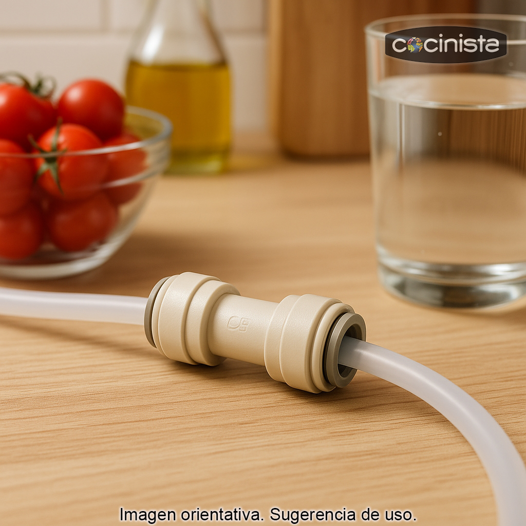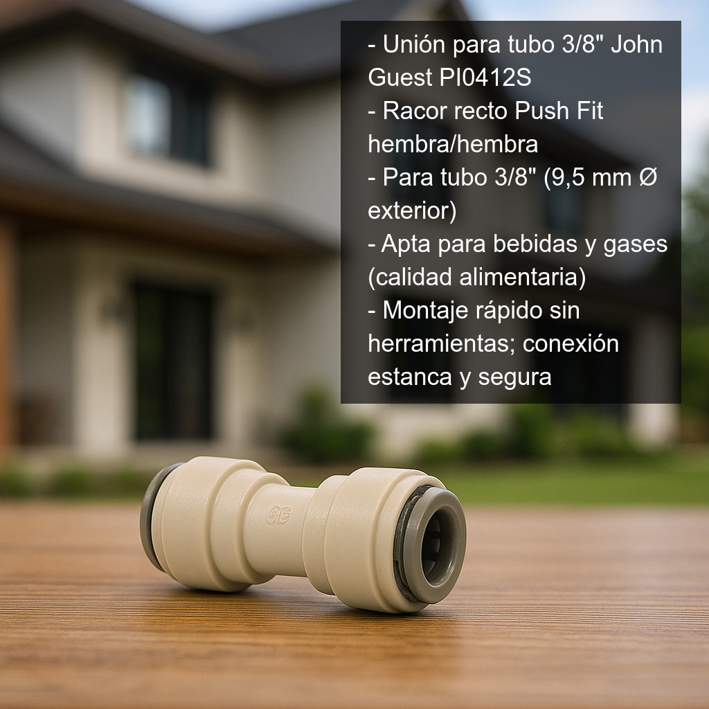 La unión para tubo de 3/8" John Guest es un conector doble Push Fit hembra/hembra (racor recto) de calidad alimentaria, diseñado para unir de forma rápida, segura y estanca dos tramos de tubo en instalaciones de bebidas y gases. Es una solución ideal para ampliaciones, reparaciones o cambios de recorrido en líneas de dispensación, filtrado o conducción.