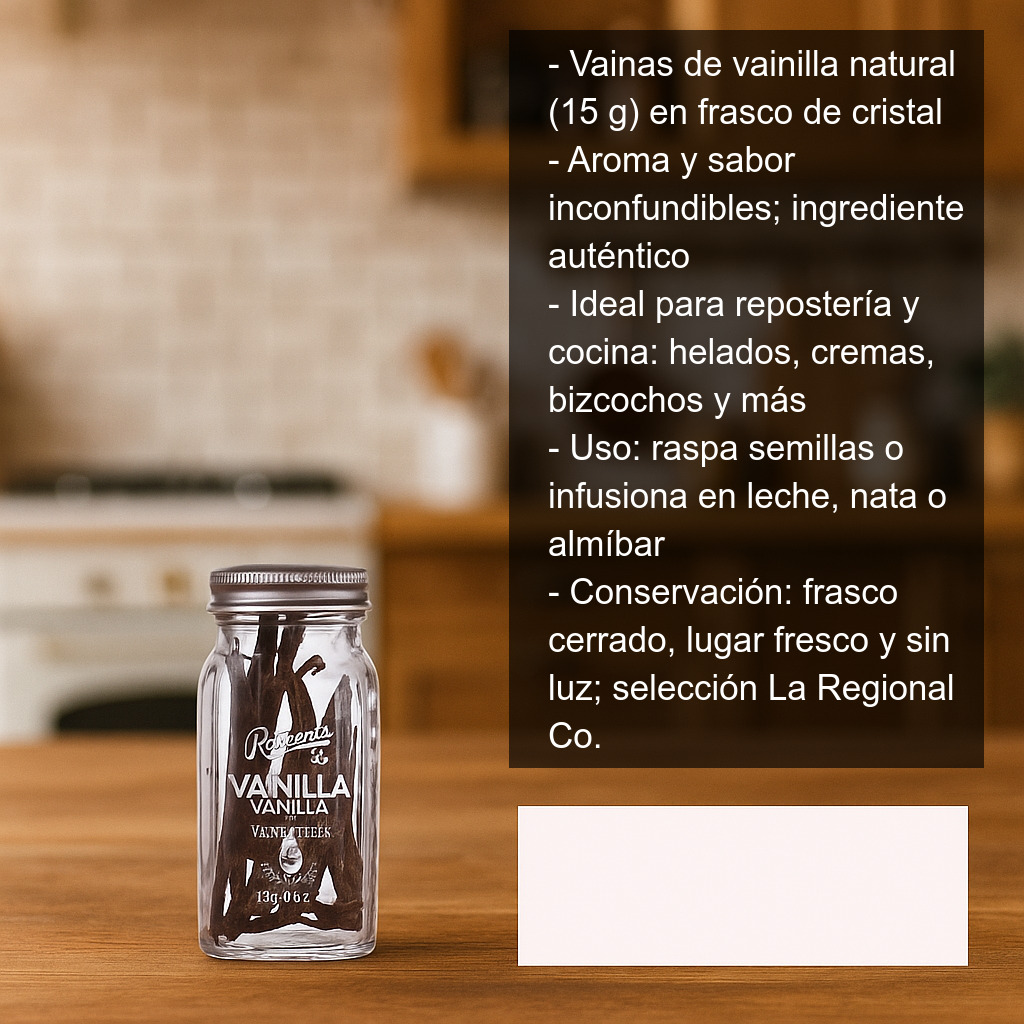 Disfruta del aroma y sabor inconfundibles de la vainilla natural con estas vainas de vainilla de excelente calidad, presentadas en un elegante frasco de cristal de 15 g que ayuda a conservar mejor su fragancia. Son una opción ideal para quienes buscan un ingrediente auténtico para repostería y cocina, perfecto para elevar cualquier receta con un toque cálido, dulce y sofisticado.