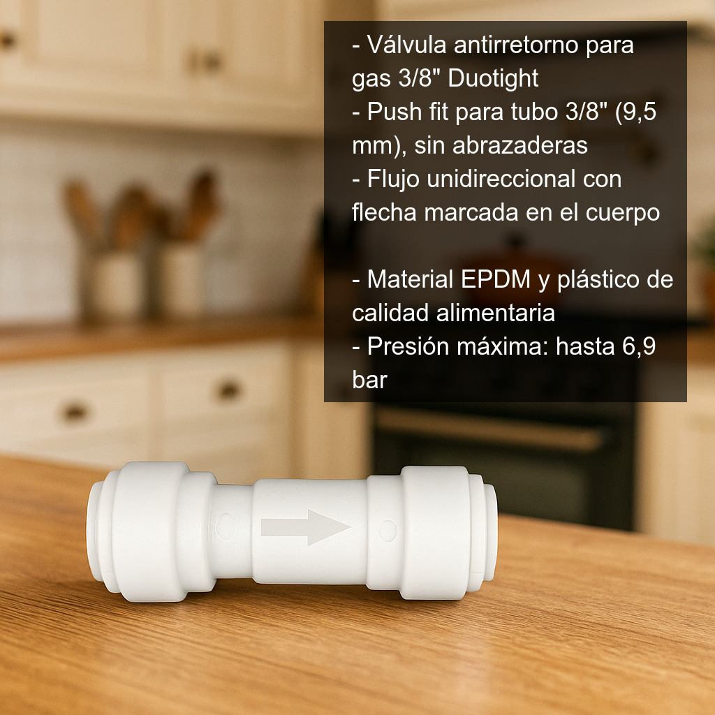 Si buscas una solución fiable, compacta y fácil de montar para evitar retornos en tu instalación, esta válvula antirretorno Duotight para tubo 3/8" es una opción robusta y segura para trabajar con gas.