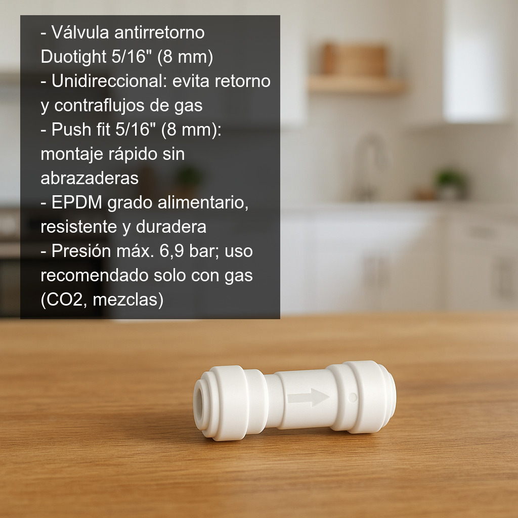 La válvula antirretorno para tubo de 5/16" (8 mm) es un accesorio imprescindible en instalaciones de gas para cerveza de barril, kegerators, dispensadores y sistemas de carbonatación. Su función es permitir el paso del gas en un solo sentido y evitar el retorno, protegiendo tu regulador, manómetros y líneas frente a contraflujos indeseados. La dirección correcta del flujo viene indicada por la flecha grabada en el cuerpo de la válvula.
