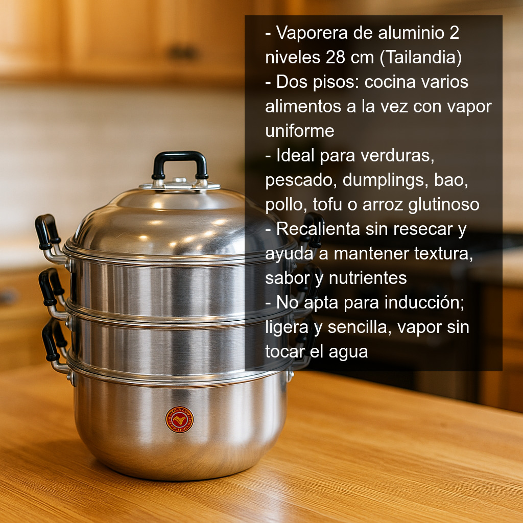 Esta vaporera de aluminio de dos niveles de 28 cm es una olla vaporera tradicional, fabricada en Tailandia, muy utilizada en la cocina asiática doméstica por su sencillez, ligereza y eficacia para cocinar al vapor. Gracias a su diseño con dos pisos, permite preparar varios alimentos a la vez, aprovechando el vapor de forma uniforme y manteniendo mejor la textura, el sabor y los nutrientes que con otros métodos de cocción.