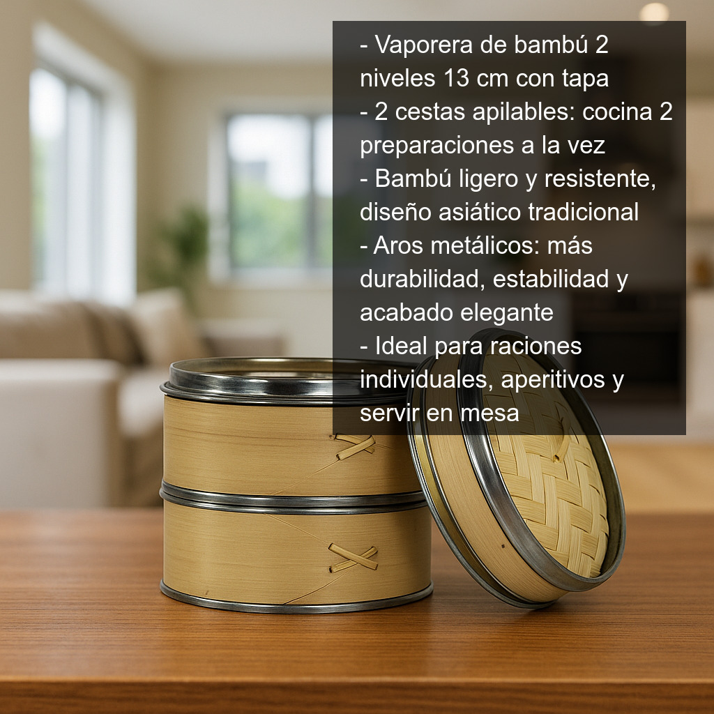 Esta vaporera de bambú de dos niveles (13 cm) es perfecta para cocinar al vapor de forma tradicional y presentar los alimentos directamente en la mesa. Su tamaño compacto la convierte en una opción ideal para raciones individuales, aperitivos o pequeñas elaboraciones, manteniendo la textura jugosa y el sabor natural de los ingredientes.
