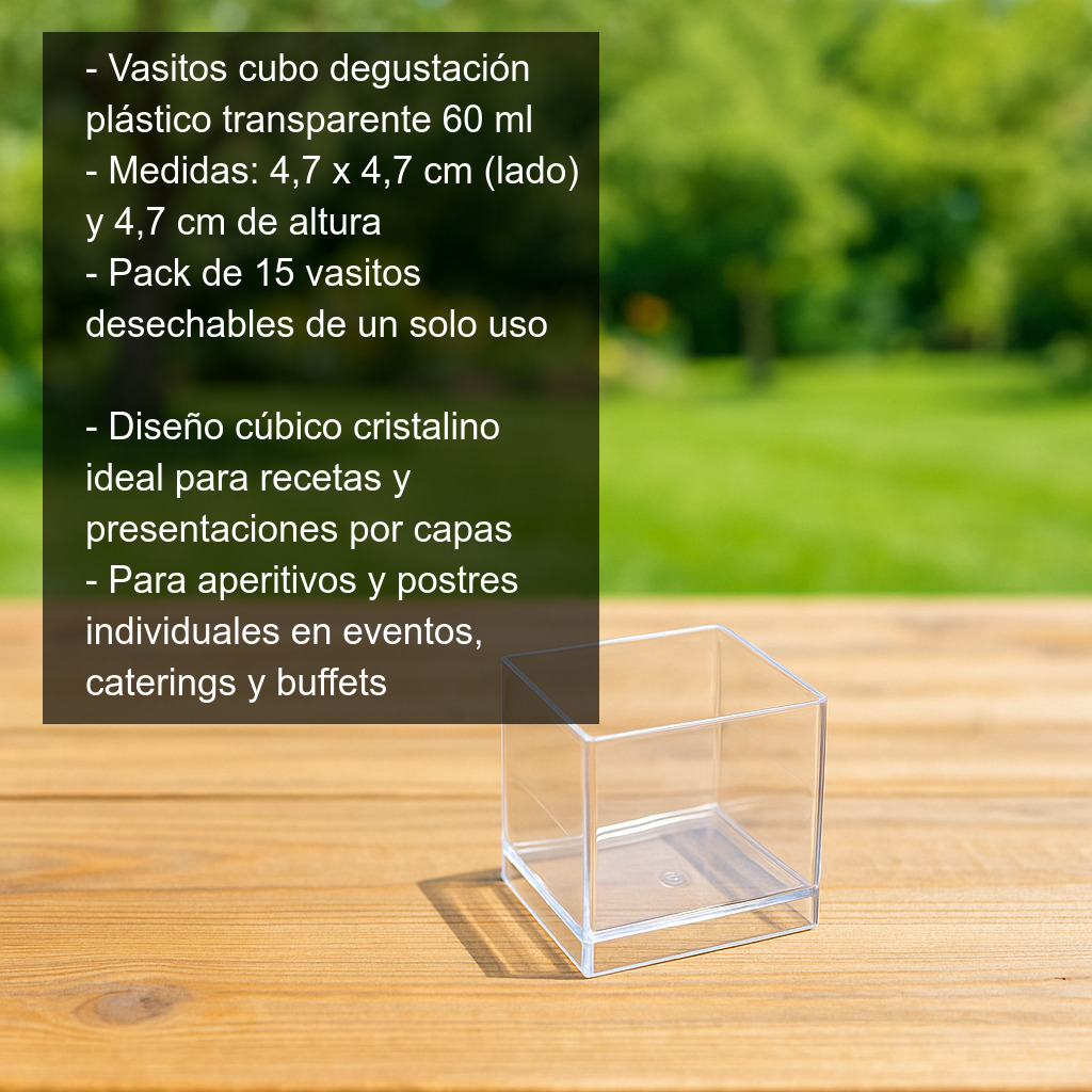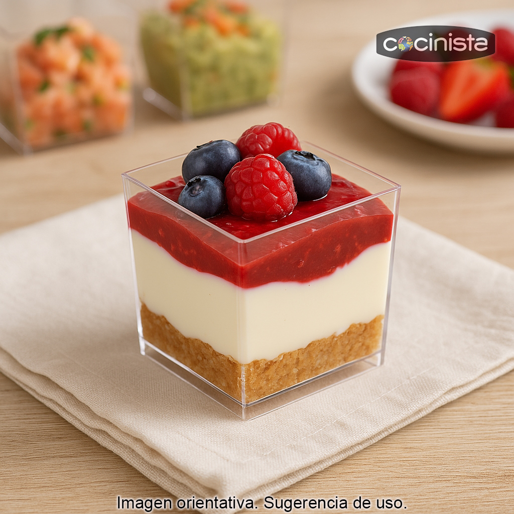 Vasitos de degustación en forma de cubo fabricados en plástico transparente de un solo uso, ideales para presentar aperitivos y postres en formato individual con un acabado limpio y profesional. Su diseño cúbico y cristalino realza el contenido y permite crear presentaciones vistosas, especialmente en recetas por capas.