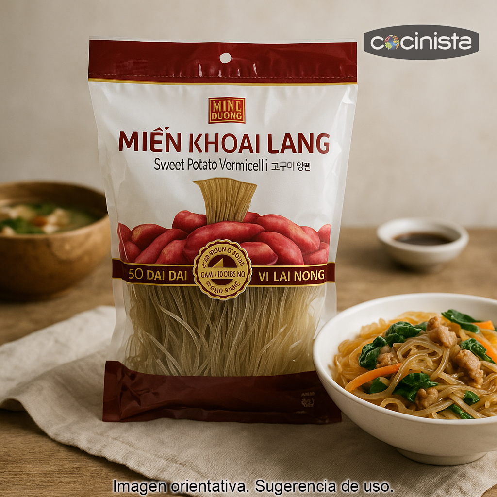 Los vermicelli de batata dulce (también conocidos como fideos de cristal o dangmyeon en la cocina coreana) son unos fideos elaborados a partir de almidón de batata, muy apreciados por su aspecto translúcido una vez cocidos y por su textura elástica y agradable. Son un ingrediente imprescindible para preparar recetas asiáticas auténticas en casa, desde sopas reconfortantes hasta salteados llenos de sabor.