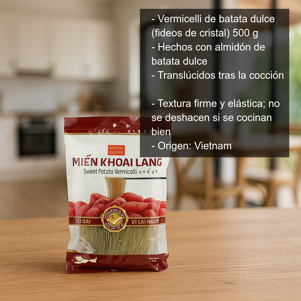 - Tipo: fideos de cristal (vermicelli) de almidón de batata dulce.