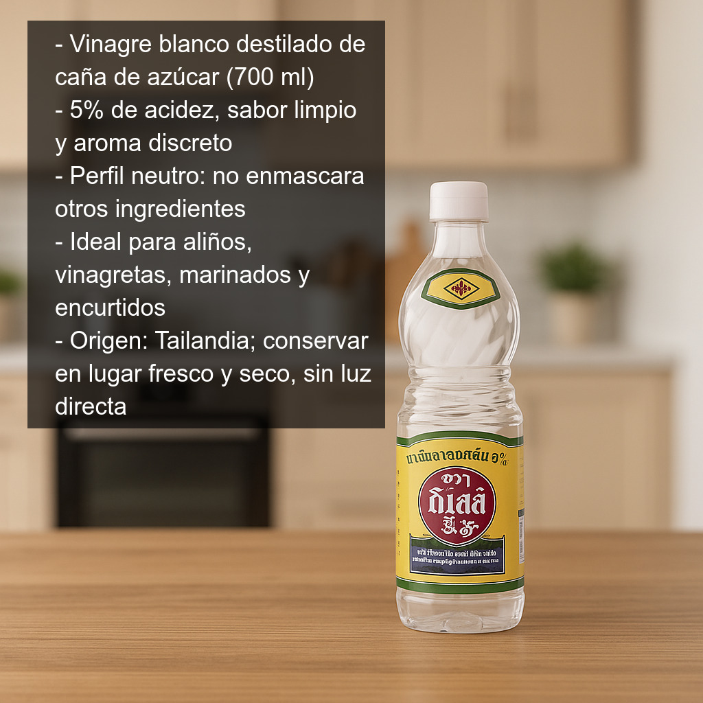 Vinagre blanco elaborado a partir de caña de azúcar, ideal para quienes buscan un vinagre suave, versátil y de uso diario en la cocina. Este vinagre blanco de 700 ml tiene un 5% de acidez y se obtiene mediante un proceso de destilado, lo que ayuda a conseguir un sabor limpio y un aroma discreto, perfecto para no enmascarar otros ingredientes.