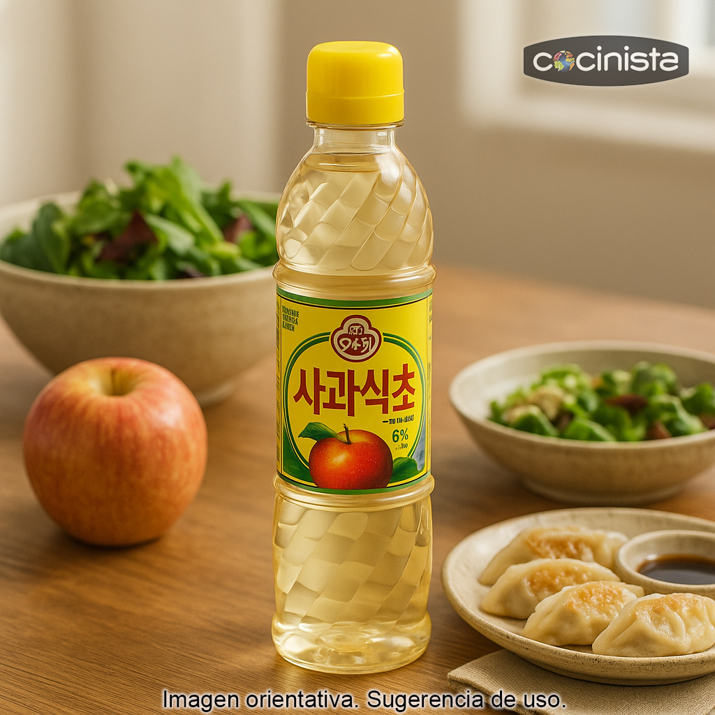 Vinagre de Manzana Ottogi (500 ml), elaborado en Corea del Sur, ideal para dar un toque afrutado y equilibrado a tus recetas asiáticas y a tus aliños del día a día.